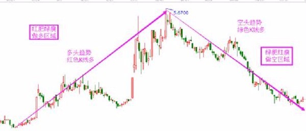 红——红色阳K线,绿——绿色阴K线,“红肥绿瘦”即红色K线多,绿色K线少,代表多头强势,处于此阶段的为做多区域,可以积极参与;反之,则为做空区域。那么,在确定一个是否要买入时,最直观的看到红色K线数大于绿色K线数,则可以重点关注。如图所示。