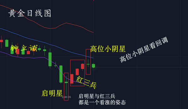 日线形态分析一下今天大体的走势,具体的细节操作建议朋友圈更新,就不做复杂的讲解。从日线上看,黄金上周三至周五形成了启明星形态,是一个看涨的形态,所以本周前两天给出了做多的思路和策略并且都取得了盈利。上周五和本周一至周二的日线三连阳形成了红三兵的形态,也是一个看涨的形态,所以周三我们给出的策略也是多头为主。
