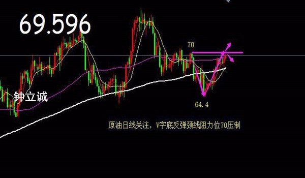 四小时死叉和MCAD向下放量都未能带动行情启动下探,操作上围绕小时图通道支撑线做布局跟进,一旦跌破趋势支撑线,将重新调整思路,小时图顶背离信号已经开始逐步出现,当行情破支撑线后,切记调整向下思路。个人综合来看,周线已转阳,形态上走进超买区域,油价大方向可能再一次挑战70美元整数关口阻力,所以日间操作思路上钟立诚个人建议短线暂以回落做多为主,反弹高空为辅,上方重点关注70.4-70.6一线阻力,下方关注68.6-68.8一线支撑。