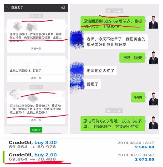 原油68.9的多单,昨晚69.8继续多, 于昨晚凌晨在70.4 止盈!收割15+6美金,昨晚的黄金空单大利润没赶上,但是原油收割21美金利润更大!再一次恭喜跟上的朋友!21美金的大利润也总算是没有错过,用你最常用的聊天工具单线,老师!