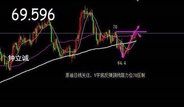 从技术面上目前已经出现了很明显的看涨趋势,并且从形态上来看,原油多头格局正在逐步构建完成,低点目前不断在上移,高点也在不断被刷新,目前下方探底后已经出现明显企稳的迹象,因此钟立诚个人更看好下周继续反弹破位。对于其下周的操作上个人建议回调做多为主,反弹高空为辅,重点关注上方70.4-70.6一线阻力,下方关注69.0-69.2一线支撑。