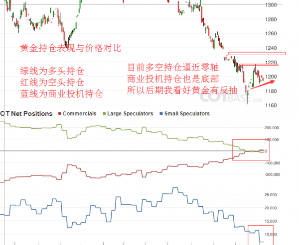 这一轮的走势在黄金测试到1160附近后的反抽就认为黄金是处于比较强势的买盘之中,不仅仅是表现在每一次的下跌后都是伴随着快速的反抽上涨,也表现在持仓方面。图表之中我们看见多空持仓都是逼近到零轴的极限所在了,而商业投机持仓也是在处于低位之中。在以往持仓出现这样的格局情况下就代表黄金价格是处于比较极限的状态了,很大程度上都会有反抽上涨出现的。