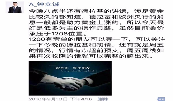 9.13老师说过(今晚八点半还有德拉基的讲话,涉足黄金比较久的都知道,德拉基和欧洲央行的消息一般都是助力黄金上涨的,所以今天最好是低多为主的操作思路,虽然目前金价承压于1208位置。1200有套单的朋友可以等一下,可以关注一下今晚的德拉基和初请,还有就是周五的情况,行情有点超前预支,周五周线如果再次收阴的话就可以完整的解出来。)