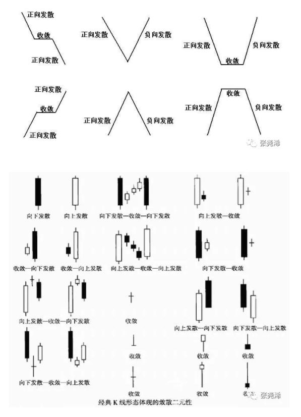 市场走势具有二元性特点,即单边走势和震荡走势,通过顾比均线的特征表现,单边走势是发散状态,震荡走势是收敛状态。更微观的看,蜡烛图也呈现敛散特征,大实体意味着发散状态,小实体意味着收敛状态。
