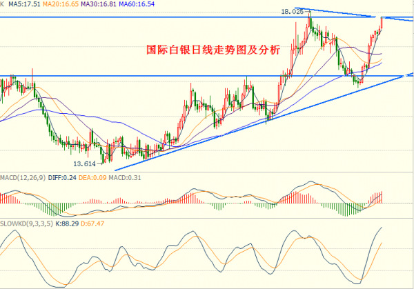 对于白银,目前价位是17.83触及前期高位附近,上方时18.025的前高位置,白银日内开盘于17.542,盘中最低是17.527,最高是17.870.目前涨幅达1.79[%]。从技术图形看,白银现在遇顶或小幅回调,其均线系统均开始拐头向上运行。技术指标MACD红柱加长,而KD指标在90区域快线快线有回落之势。对于白银,已上涨0.311美元之后,美盘继续看多至18.05附近。