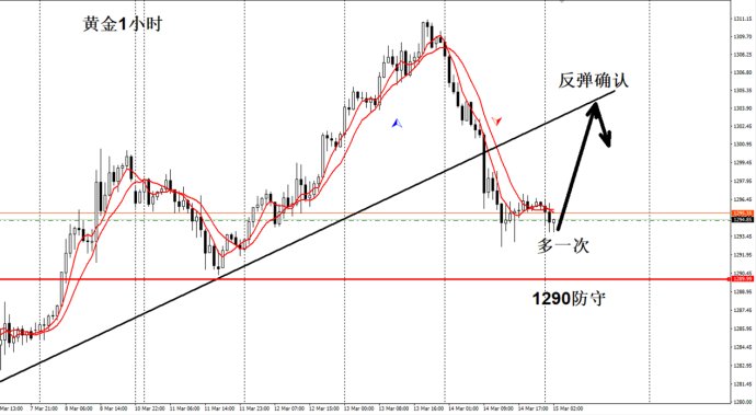 如图,虽然昨天持续的下跌,但凌晨反弹之后,周五早上没有测试,而是直接回落,向下测试1292-93的支撑位置,这种走法往往会出现诱空的嫌疑,导致价格在午后向上反弹,前期的支撑点在1290,以此为支撑位置,下周一在1293-94附近直接进场多一次,也可以等高点到位了做回落,虽然突破做回落有点风险,可是很鸡肋的现象会导致利润空间大大缩小,让后面的操作进退两难,如果周一亚欧盘像本周五一样走弱,美盘跟空即可。