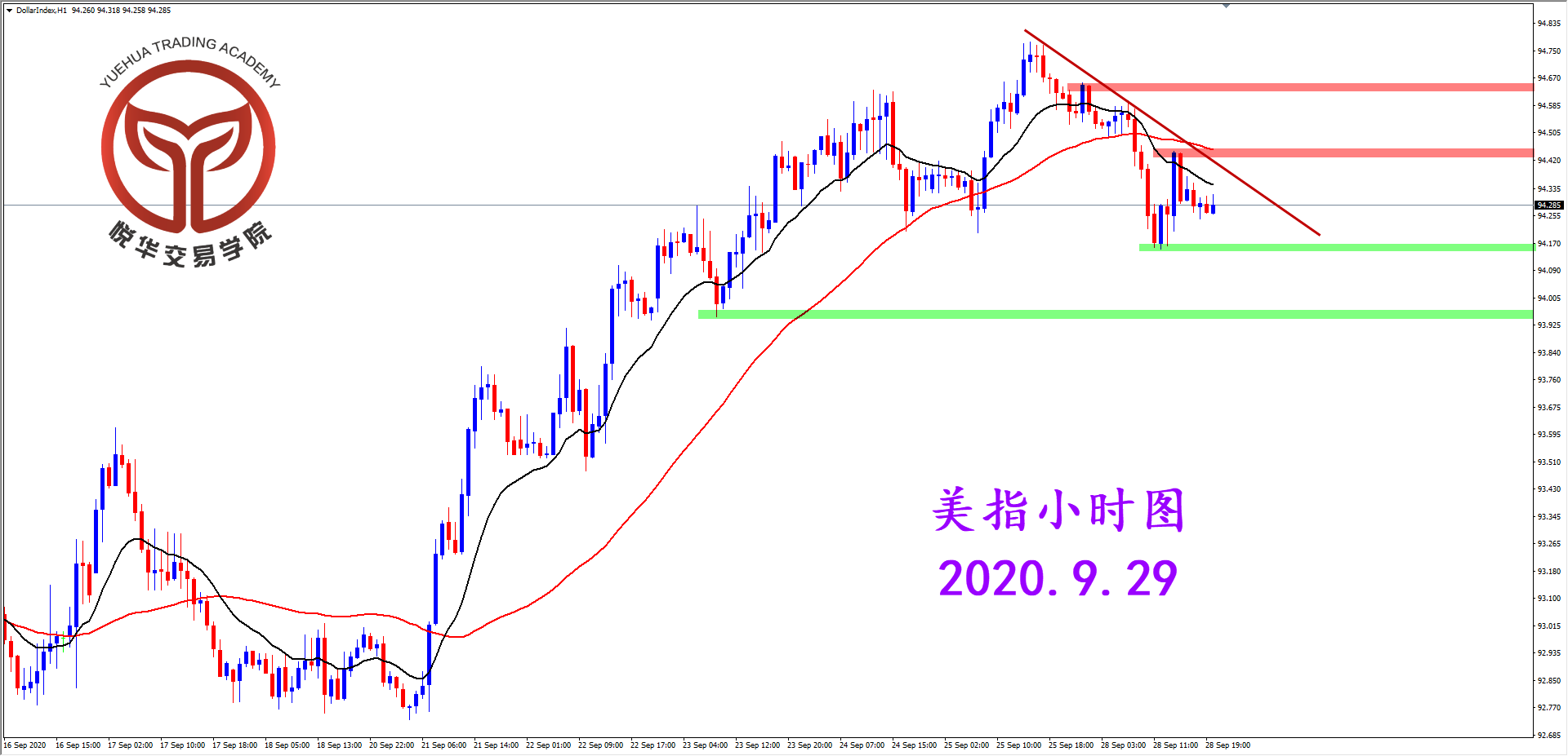 美指小时图,短线的均线也开始空头排列,且形成了短线空头流向,下降趋势线也有压制作用,交易方向暂不明朗,谨慎观望为主。