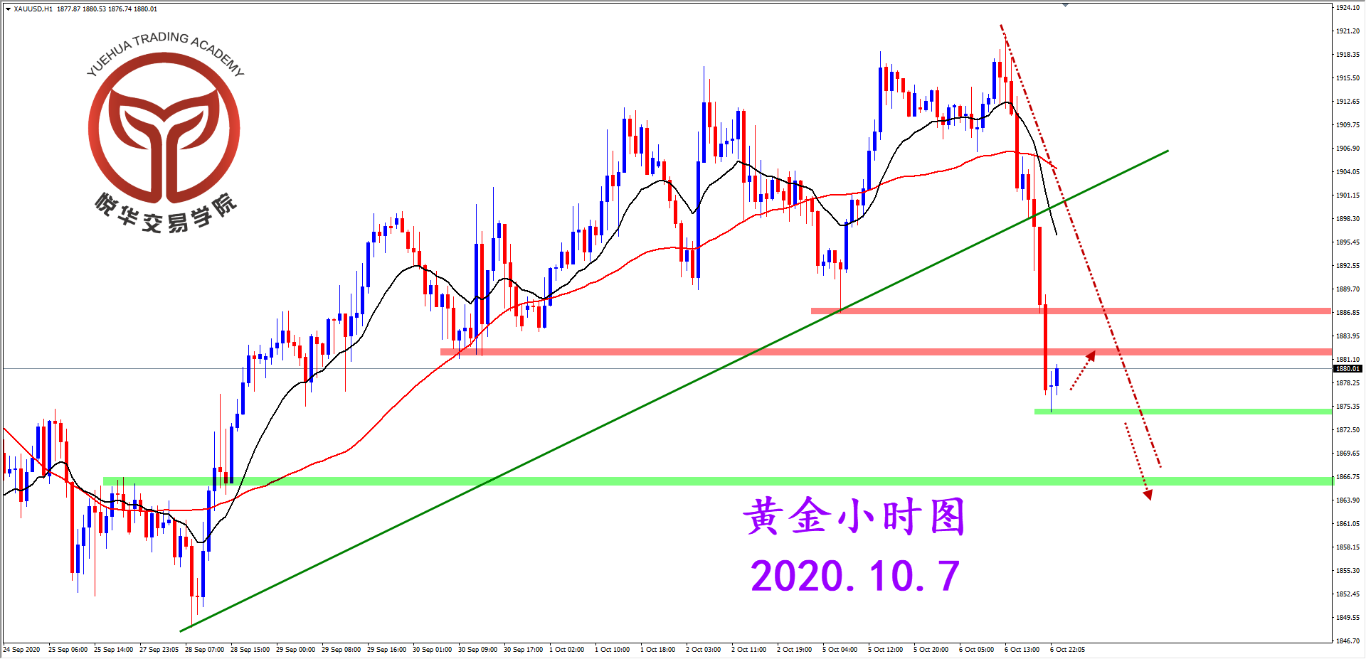 现货黄金小时图,短线下跌极端市场需要调整,凭借水平压力以及均线压制等待充分调整后的破日内低点的空头机会。