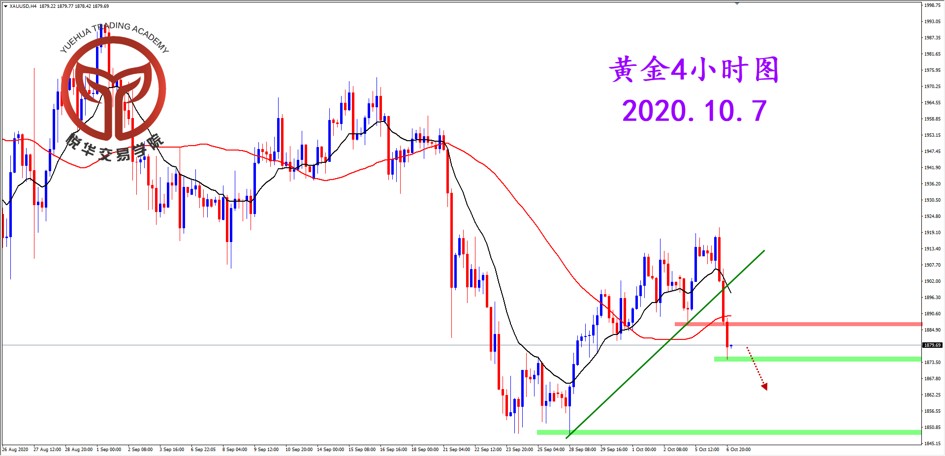现货黄金4小时图,支撑线被坚决的连续的大阴线跌破,空头势头强劲,但在没有充分调整前谨慎追空,等待调整后关注空头。