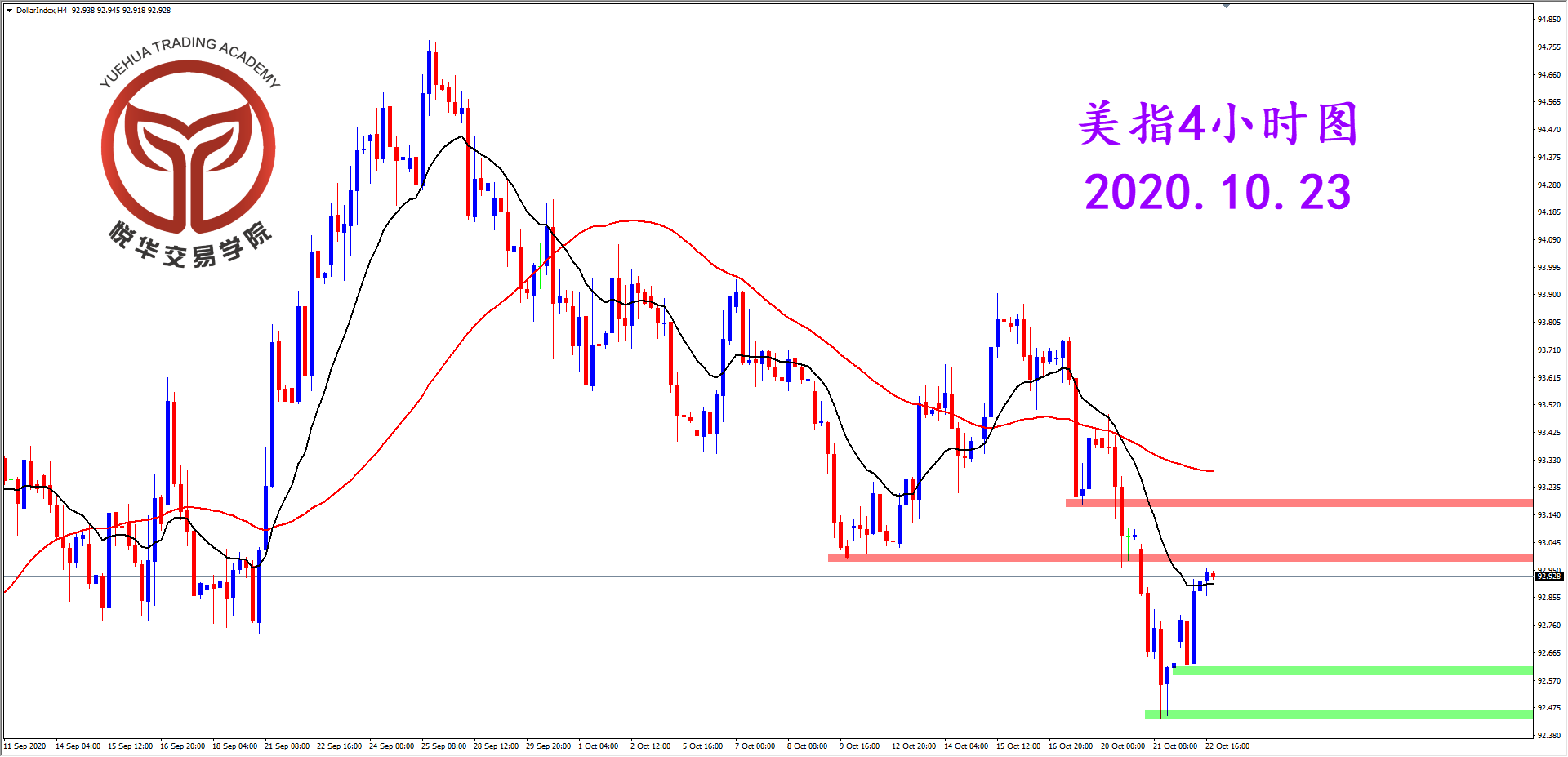 美指4小时图,行情触底反弹,目前在回测均线压制以及水平压力位置,压力的共振带会给市场一个强压制但能否走弱还要看市场表现,不建议投资者臆测行情勉强交易。