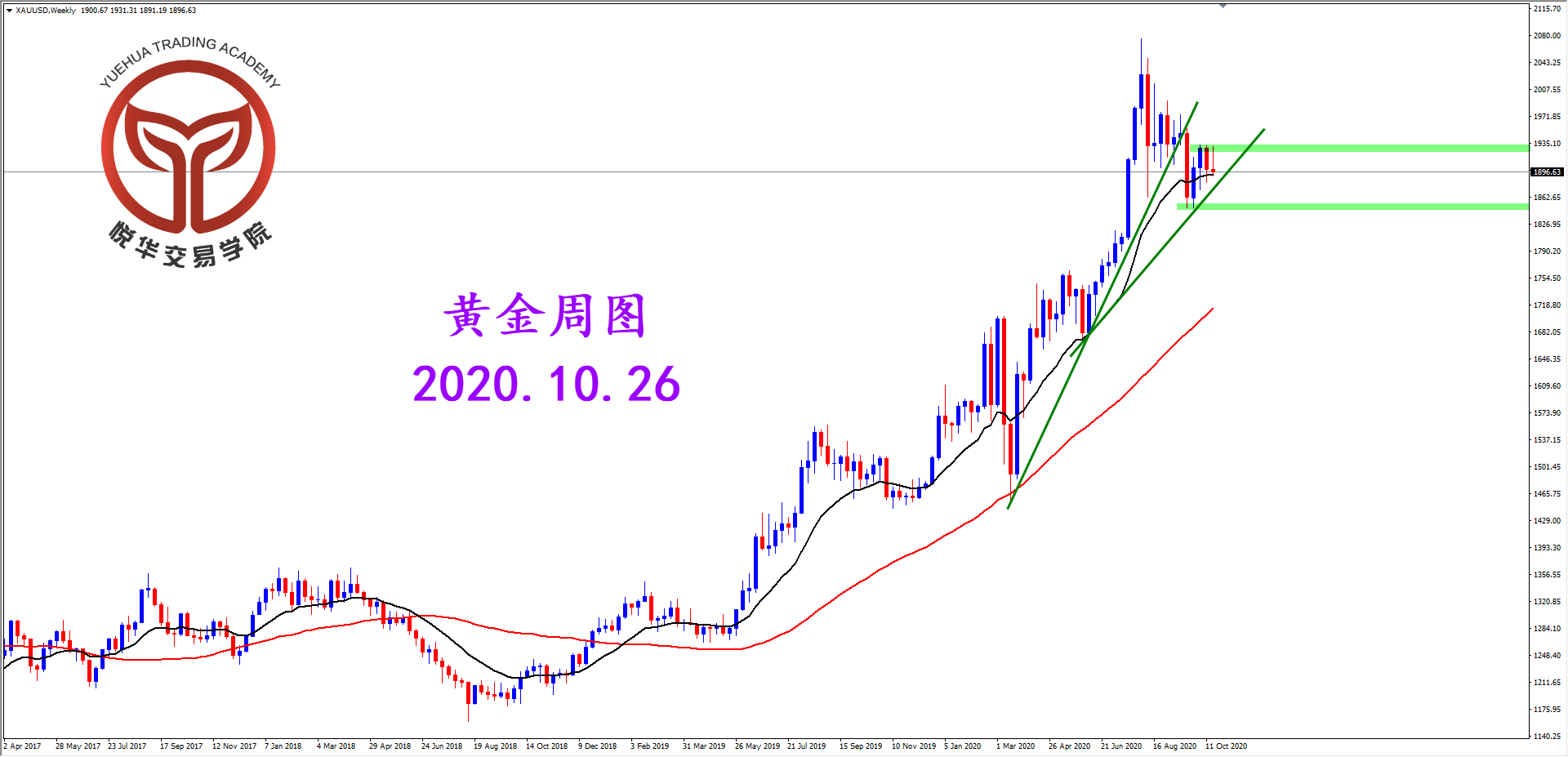 现货黄金周图,上周行情收出不确定的蜡烛形态,目前行情连续三周止步于15EMA均线附近,目前总体行情还处于高位震荡调整,大格局偏强但交易方向不明,对于日内来说还需要耐心等待观望。