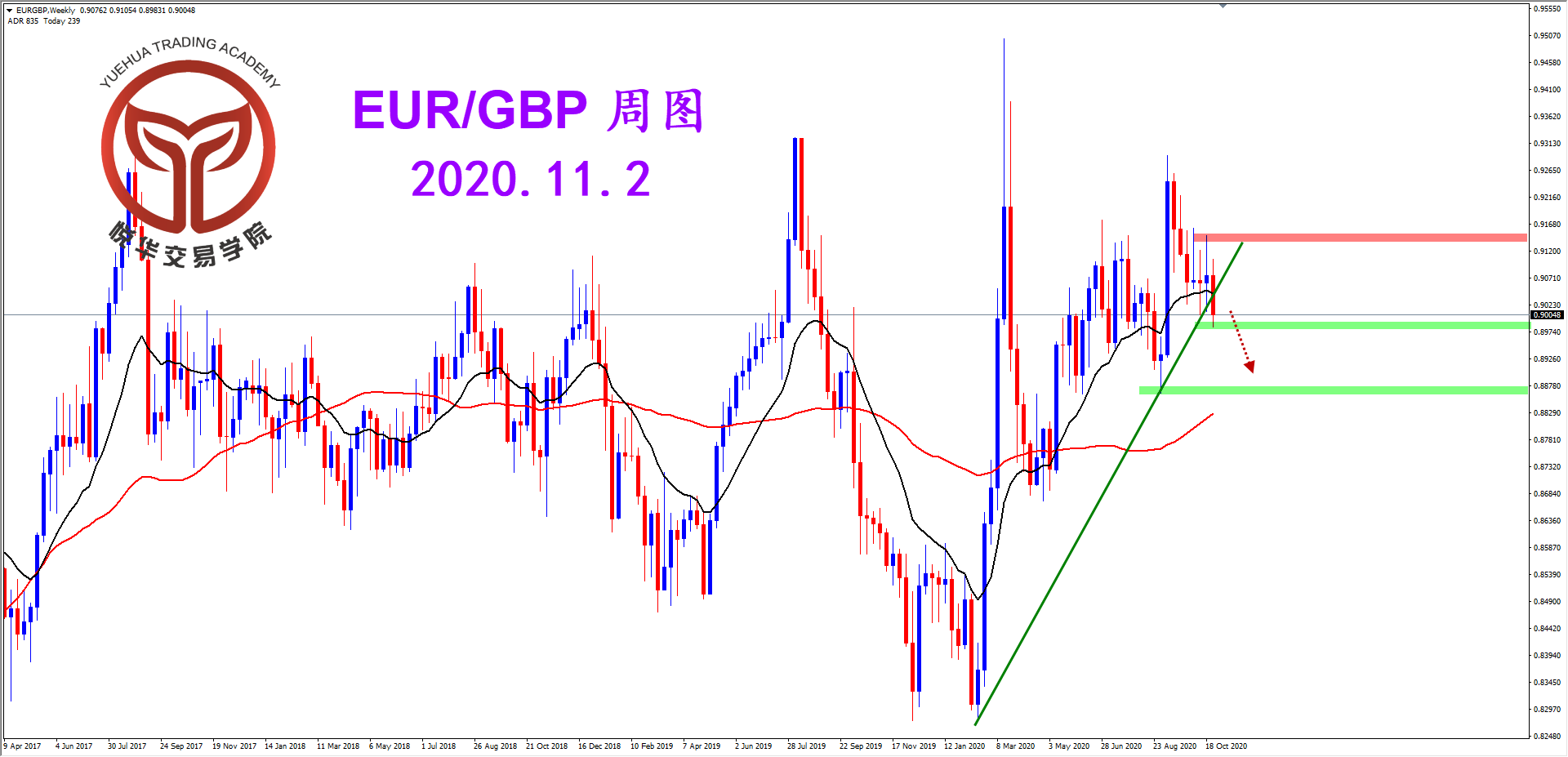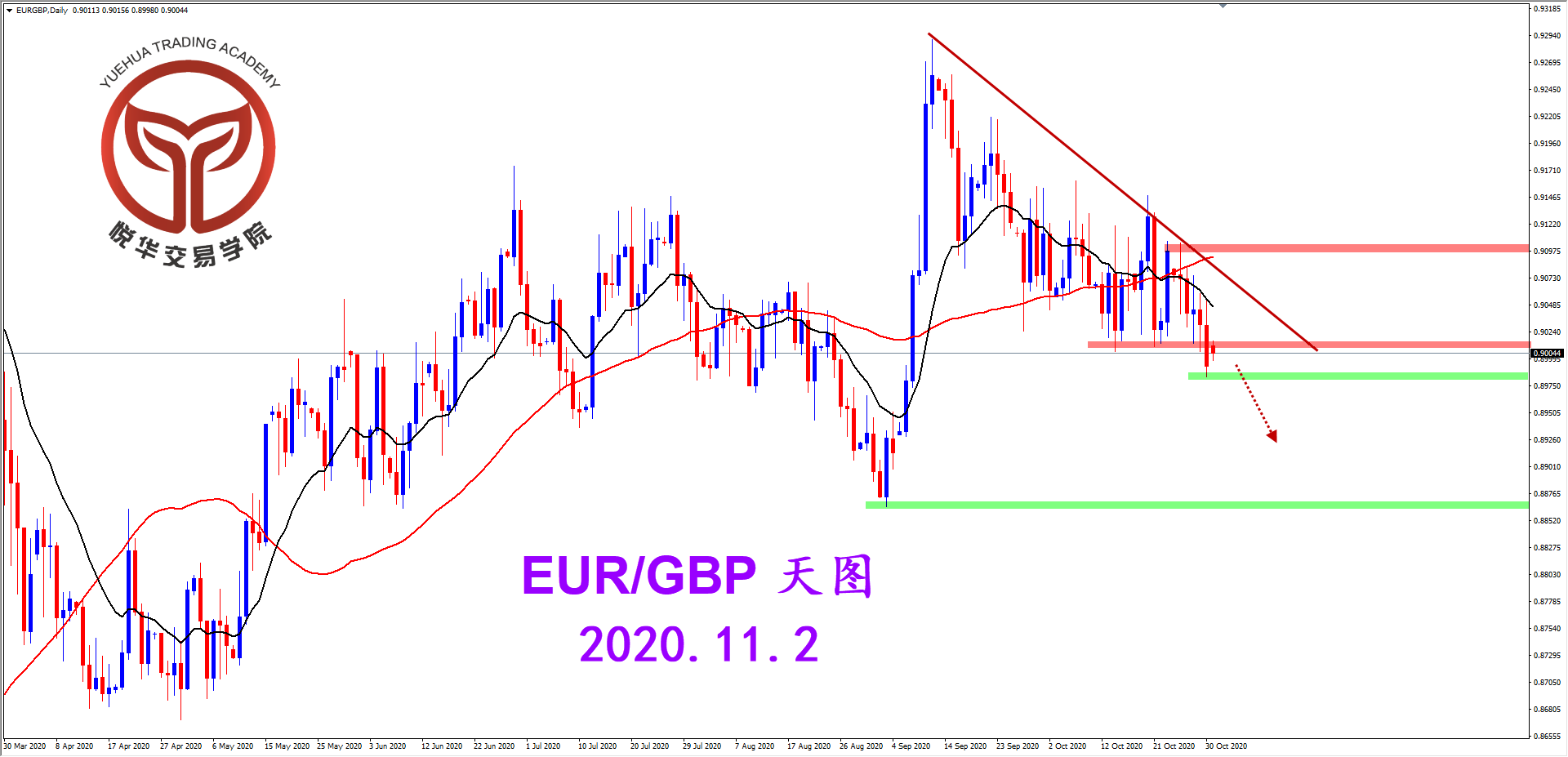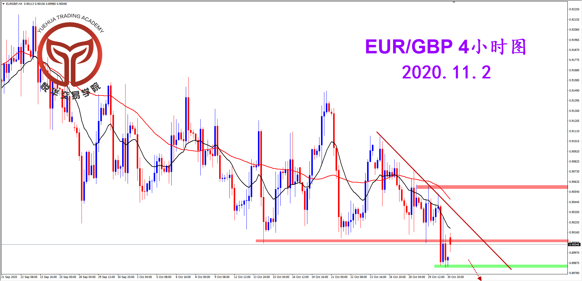 欧镑经过复杂的调整后市场选择的下跌走弱,并且坚决跌破了天图级别的支撑线以及0.9006的水平支撑位置,奠定了空头方向与基调,方向明显的情况下就顺势关注高概率做空机会,除非行情大幅反转拉升。