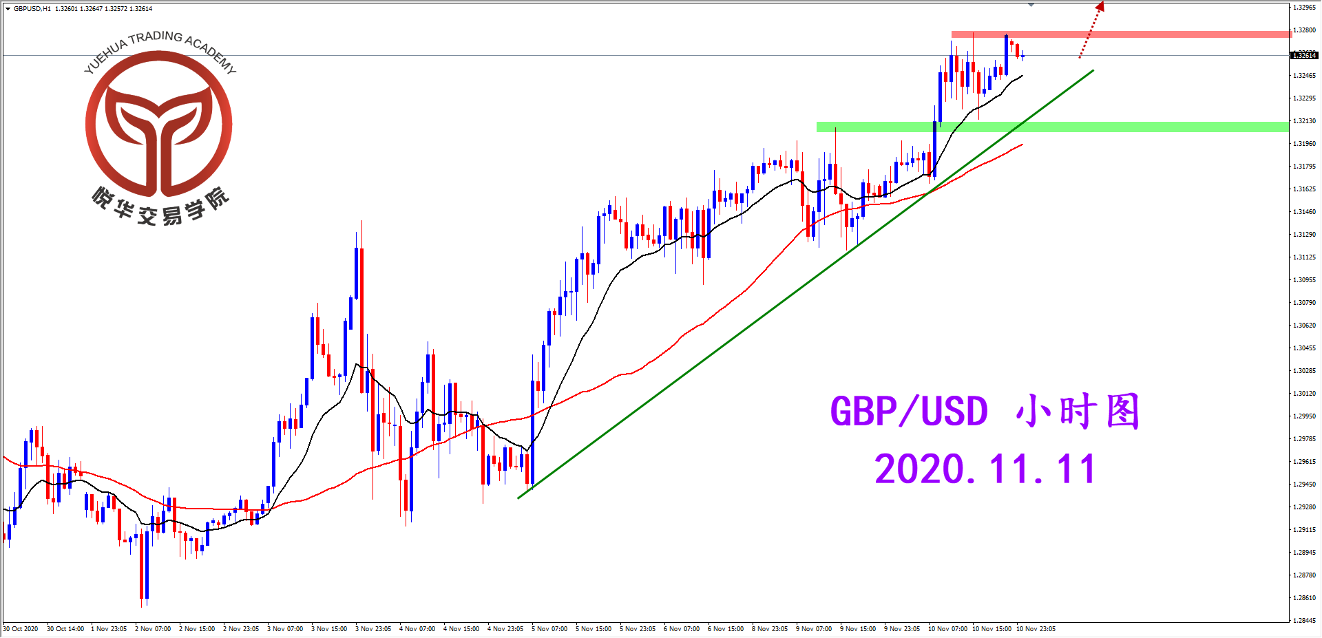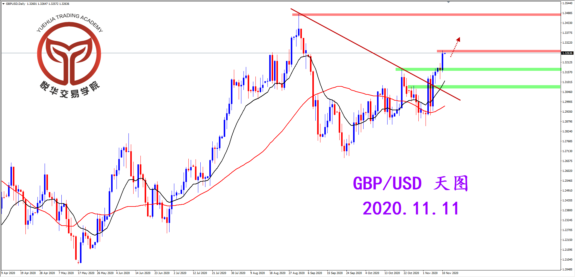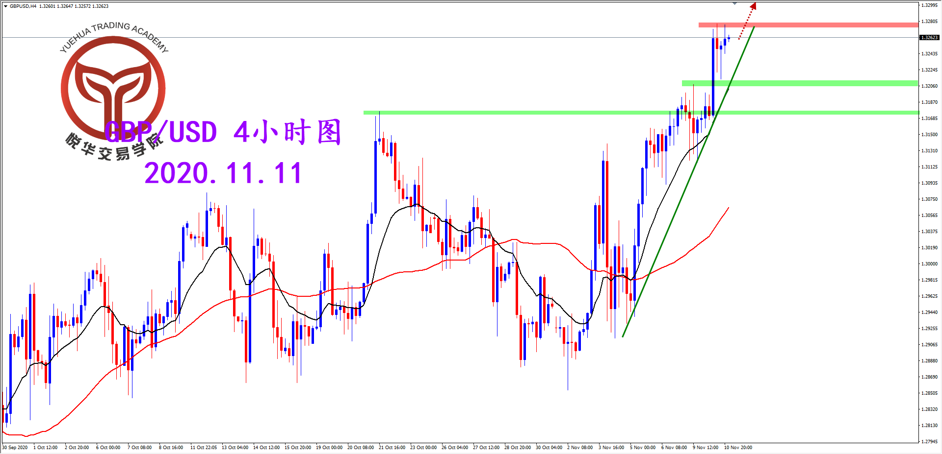 镑美天图,昨天行情收出比较规整的坚决阳线,虽然前面在压力位置附近调整了几天但最终还是多头占据主导,方向明显,等待调整后的多头机会就好。