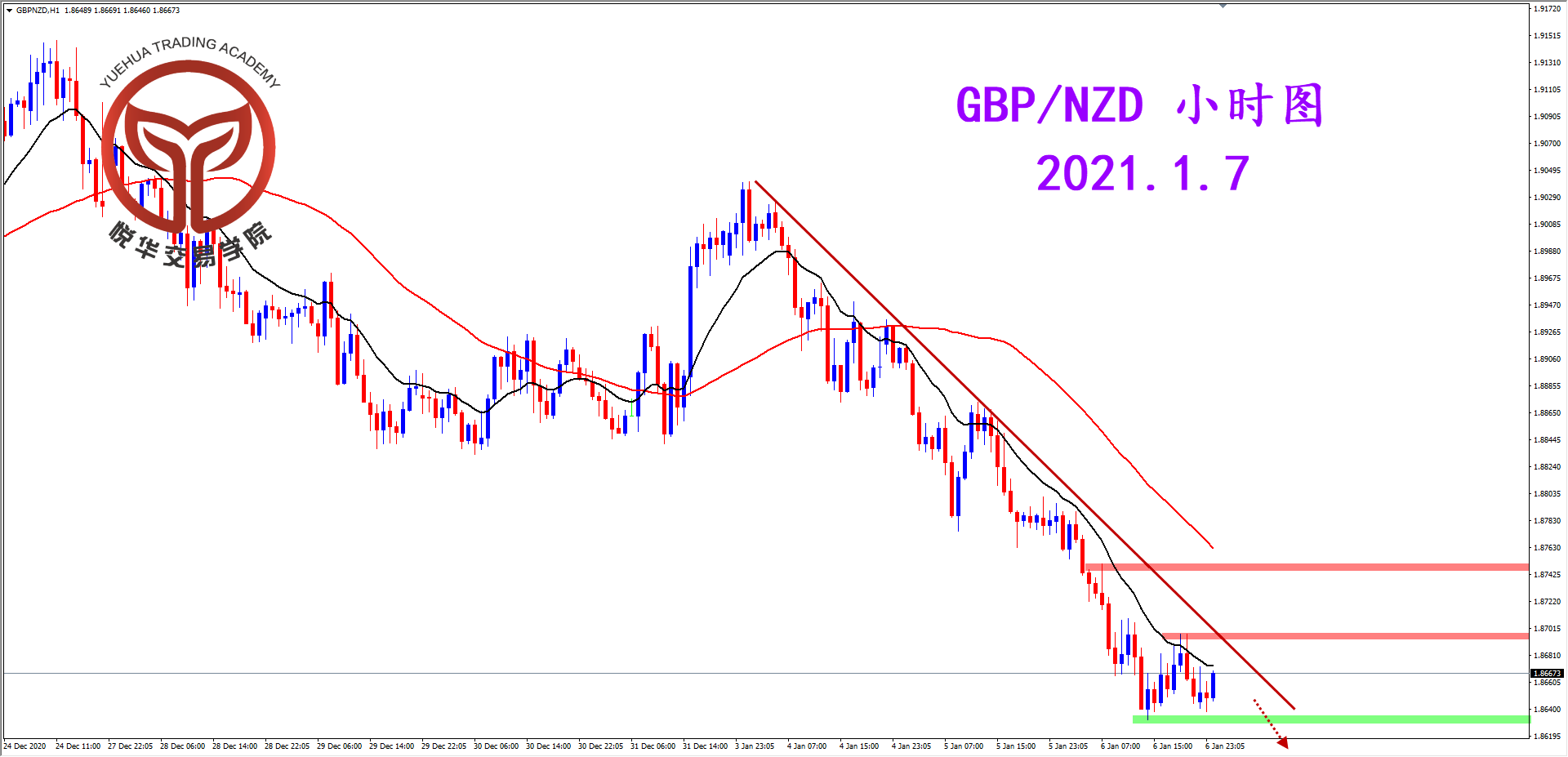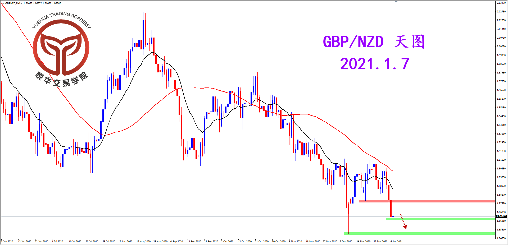 镑纽天图,昨天行情收出坚决大阴线,坚决跌破前期低点,空头方向相当明显,目前行情有继续下跌机会,目标位置看到下方1.8518一带,而昨日空单可以考虑继续持有。