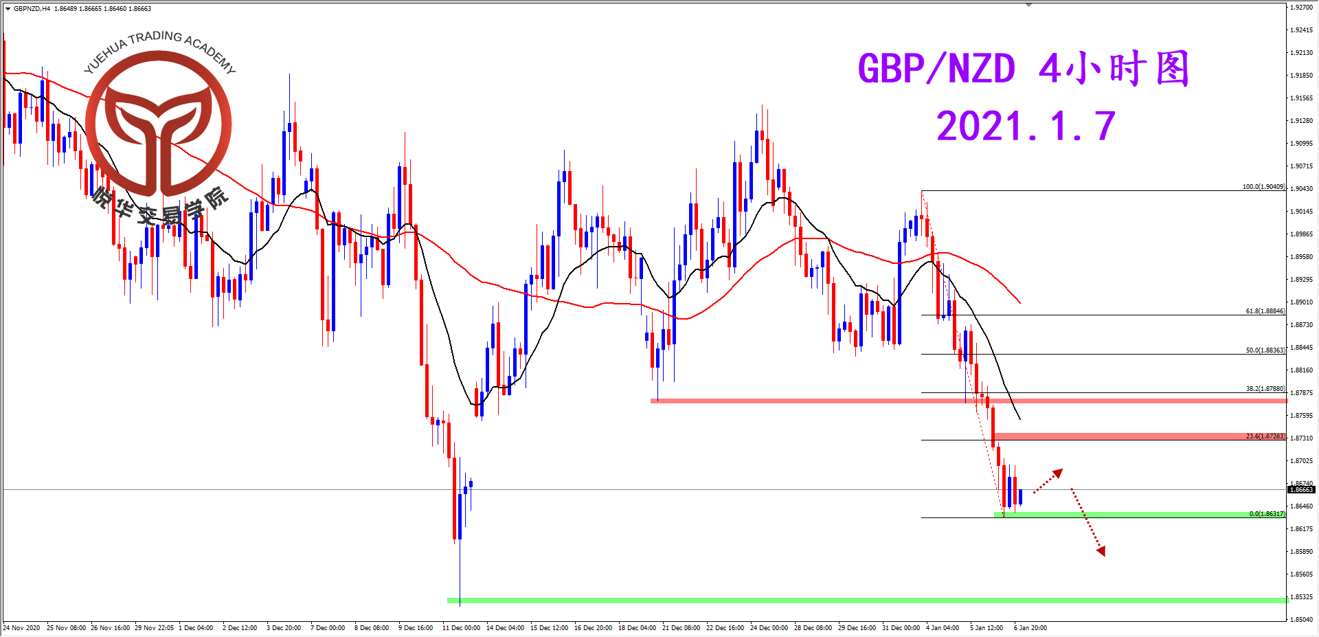 镑纽4小时图,行情一路下跌走弱,单边空头相当弱势,短线也需要耐心等待充分调整后才能继续关注空头,凭借斐波那契回调位置关注高概率的破位空头机会。