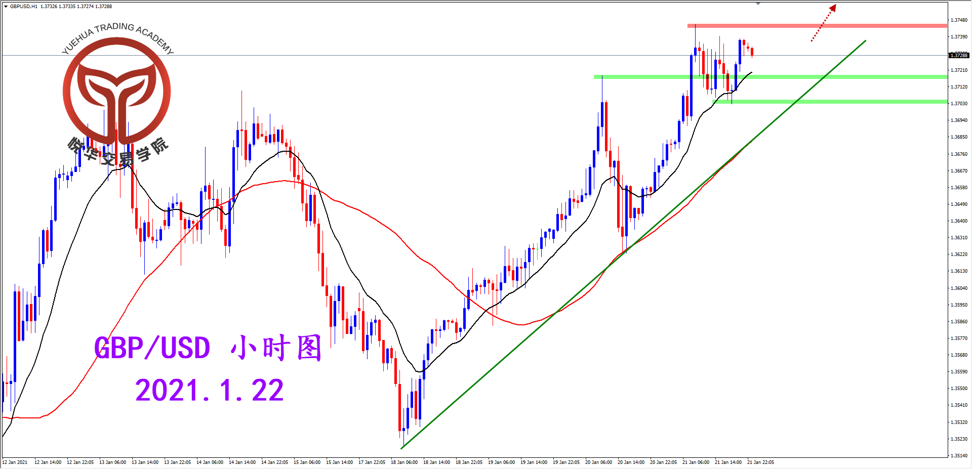 镑美小时图,行情大幅回撤后再度回到多头趋势里面而走强,目前高位调整,等待强势突破后适当关注短线多头机会。