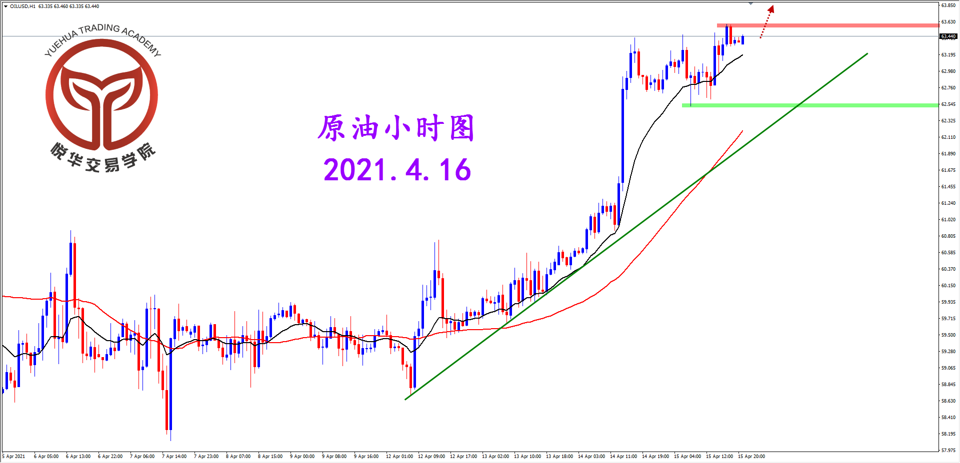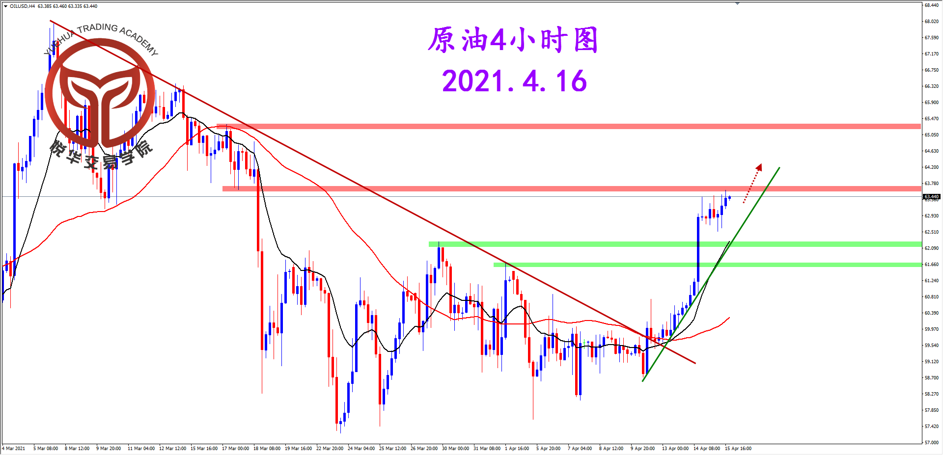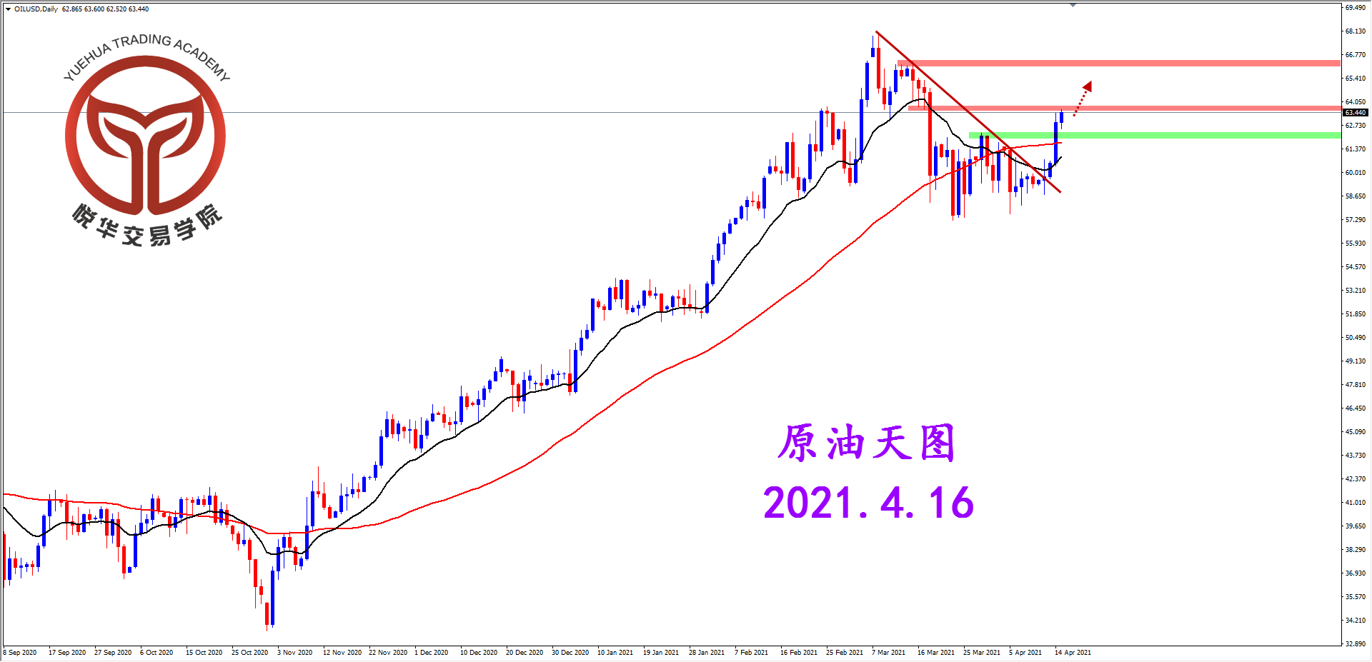 原油天图,前一天行情强势突破压力线以及62.12的水平压制,奠定了多头方向与基调,而昨日的行情在63.56压力位置附近进行调整,日内密切关注高概率的破位多头机会,目标位置看66.35一带。
