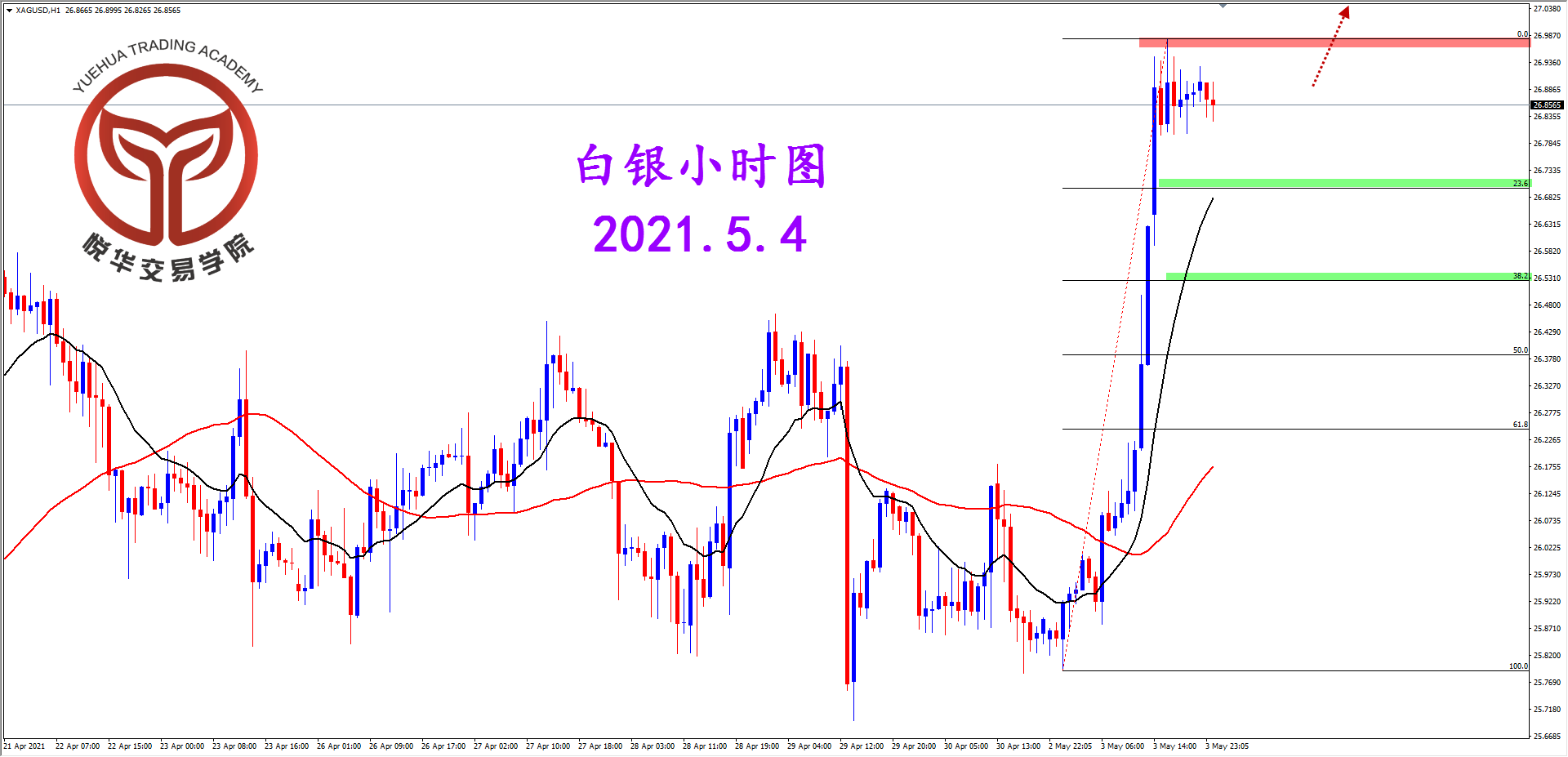白银小时图,短线拉升极端,稍有超买情况,不要急于追买,等待必要回调动作,凭借均线以及斐波那契回调位置关注调整充分后的高概率的破位多头机会。