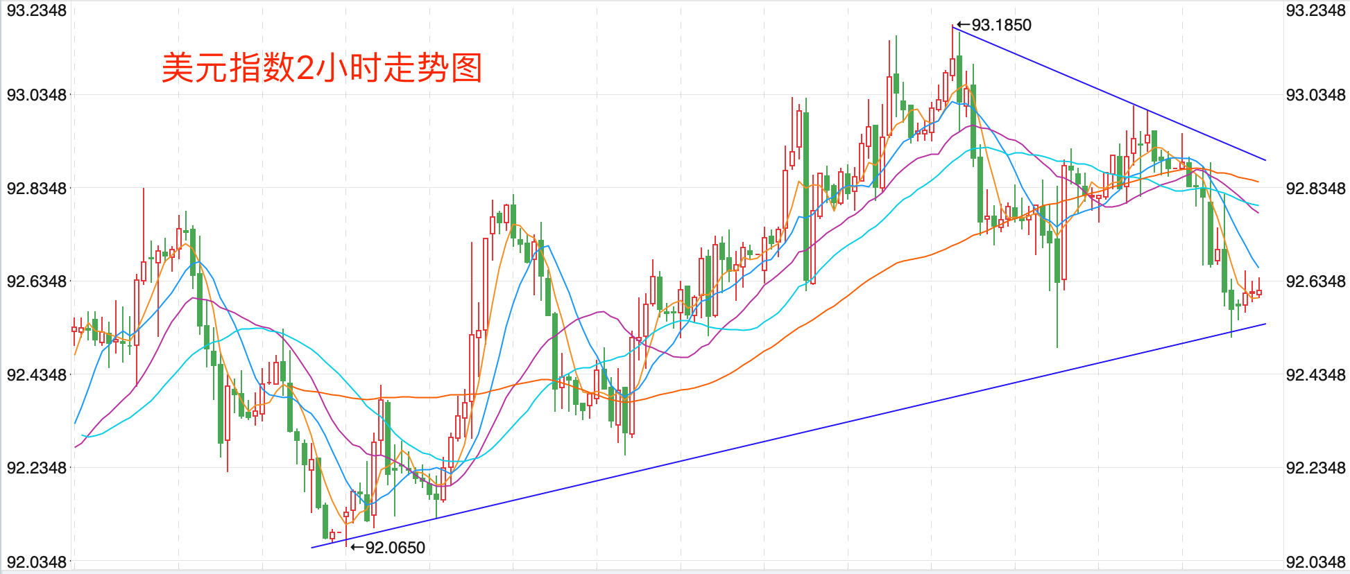 前期持续上涨创出102.99点的高位后一路震荡回落走低,触及89.206点的低位后,开始向上持续震荡走高;整体价格在MA200上方运行。中期走势继续保持震荡向上的走势,价格突破93点的关键阻力打开上行空间。当前行情日内考验92.5的关键支持,跌破则继续向下。