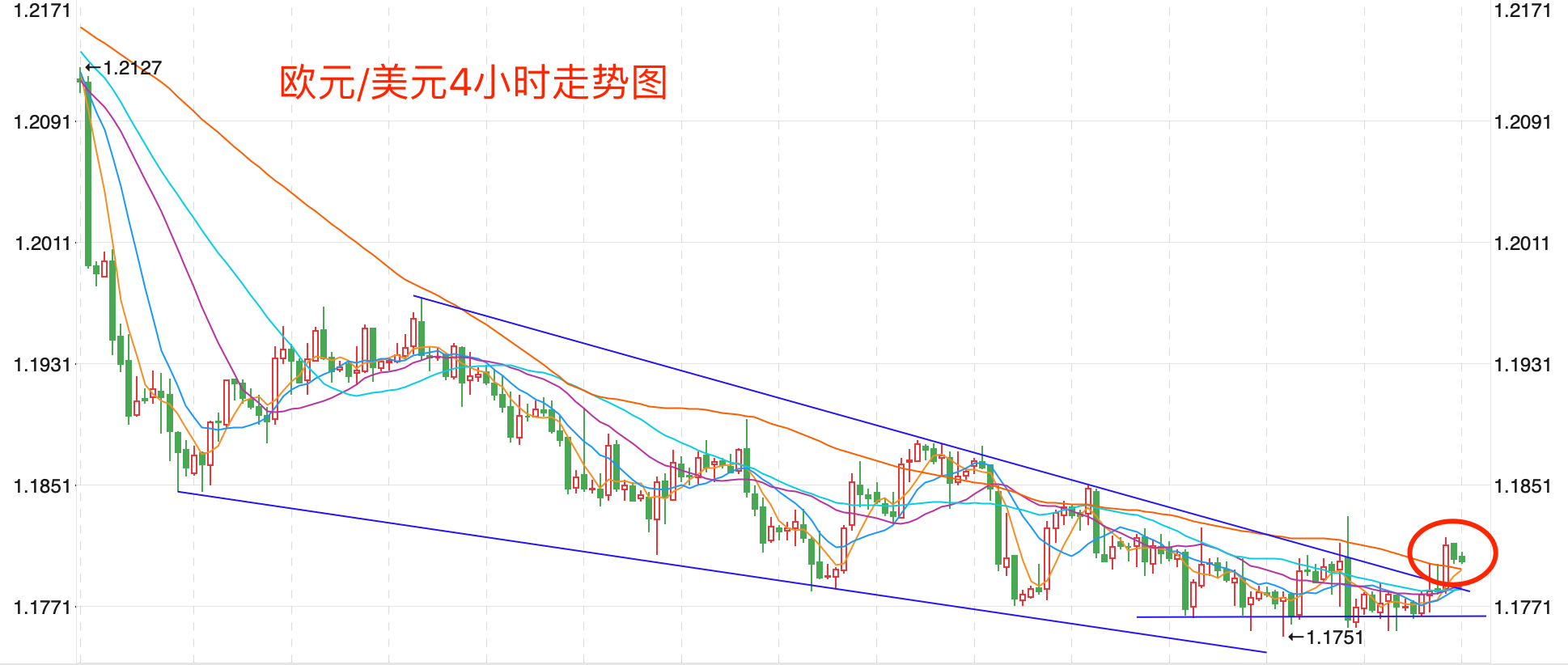 前期自2020年3月底企稳1.0635低点开启上涨走势;2021年1月触及1.23495点的高位后持续震荡下行。当前走势是回落企稳1.17点的中长期多空分水岭的支持后,二次反弹走高触顶后中长期处在回落调整的下行走势中;汇价整体运行在MA200均线下方形成走低趋势。当前行情日内有继续回落测试1.18 支持的趋势,不破继续触底反弹趋势。