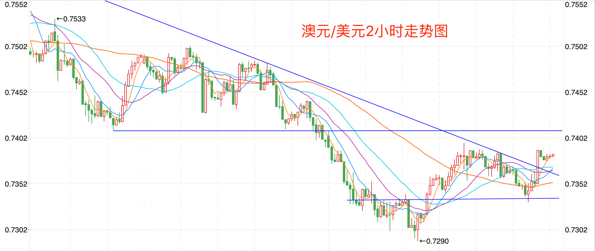 前期自2020年3月底企稳0.56618低点开启上涨走势;盘中突破了MA200均线的关键阻力而上行走高;2021年2月触及0.80072点高位后开始震荡走低。近期澳元走势企稳0.7290点后震荡走高;当前行情日内有企稳继续向上的趋势。