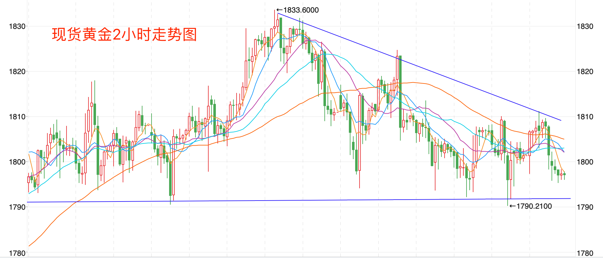 金价从1445美元/盎司的前期低点一路展开上行,创出之前2075的新高后,先回落后持续震荡下跌达到11个多月。当前整体价格在MA200上下运行,MACD指标弱势震荡,目前形成继续下跌对走势。日内短线走势将以1790美元关键的支持继续震荡调整,跌破则打开下行空间;关注美元反弹对黄金的施压影响。