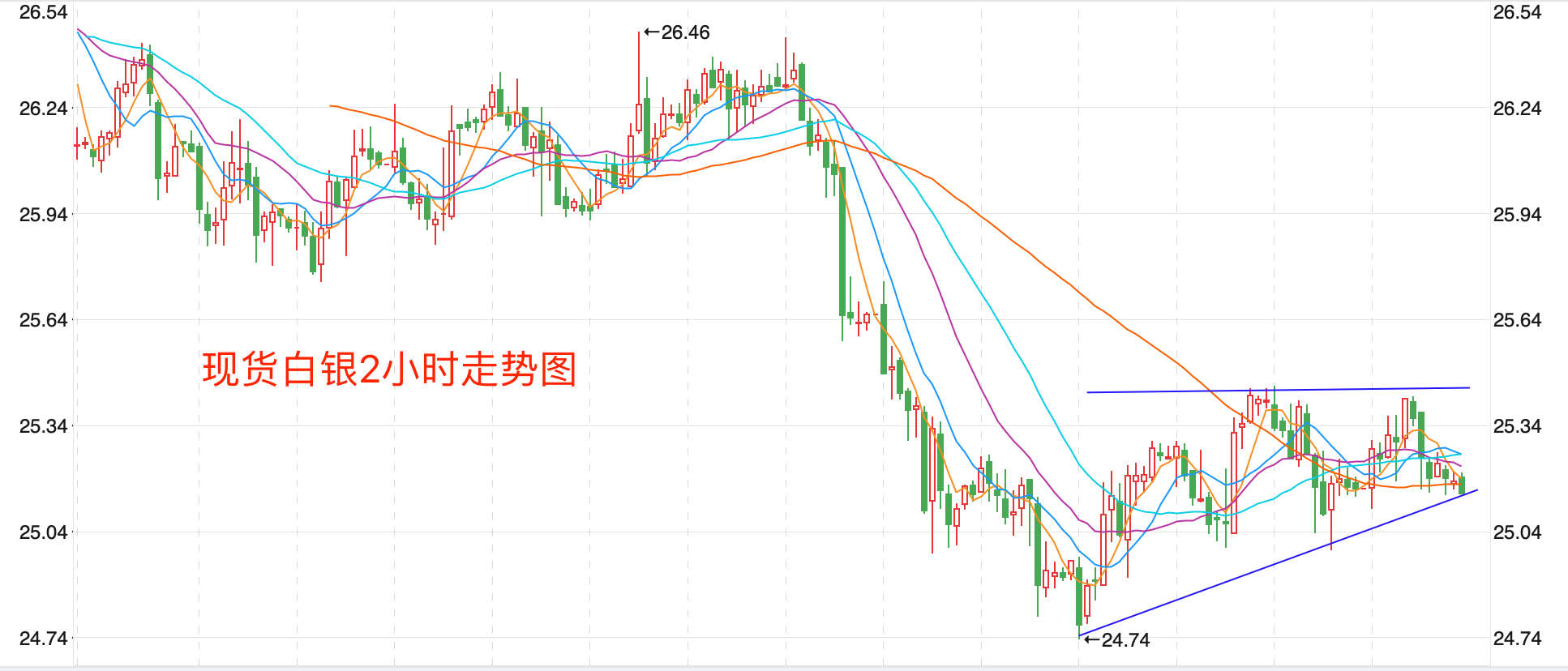银价从19.64/盎司附近大幅下跌回落,创出五年来的新低到11.29美元附近,随后价格一路反弹上行,两次上涨达到30美元后展开回落。目前整体价格在MA200下方运行,MACD指标企稳弱势震荡,目前下行趋势线被跌破形成向下的走势格局。60日均线阻力已被跌破打开下跌空间,日内短线有继续下行测底的趋势。