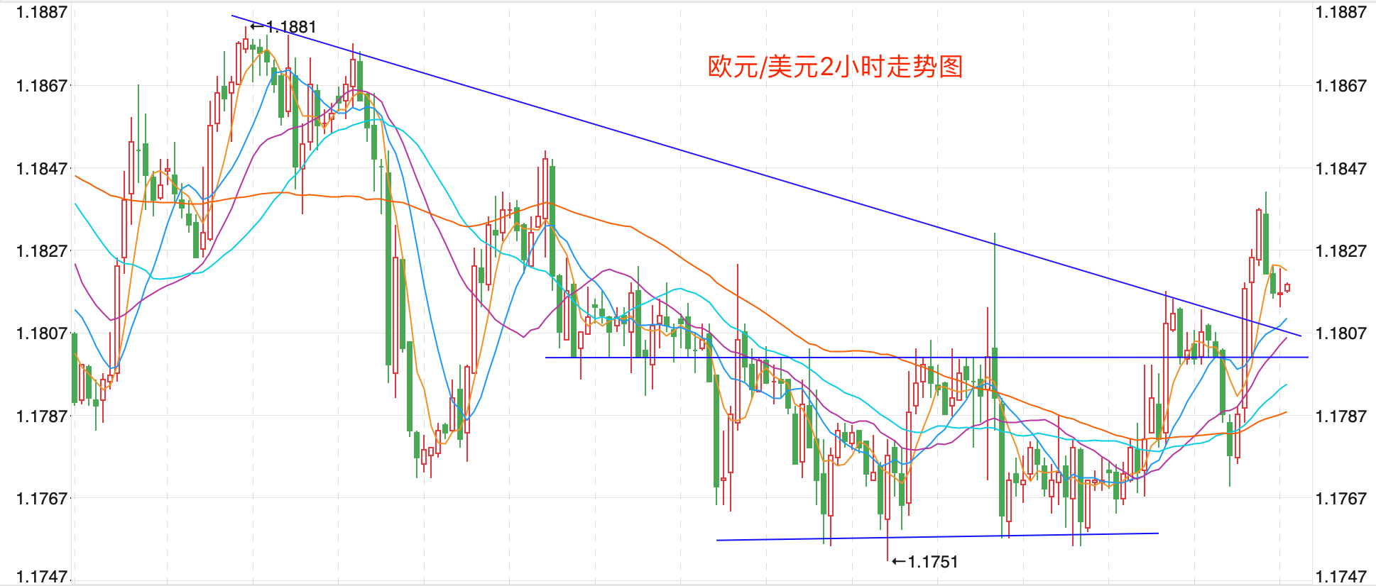 前期自2020年3月底企稳1.0635低点开启上涨走势;2021年1月触及1.23495点的高位后持续震荡下行。当前走势是回落企稳1.17点的中长期多空分水岭的支持后,二次反弹走高触顶后中长期处在回落调整的下行走势中;汇价整体运行在MA200均线下方形成走低趋势。当前行情日内有继续回落测试1.1800支持的趋势,不破继续触底反弹趋势。
