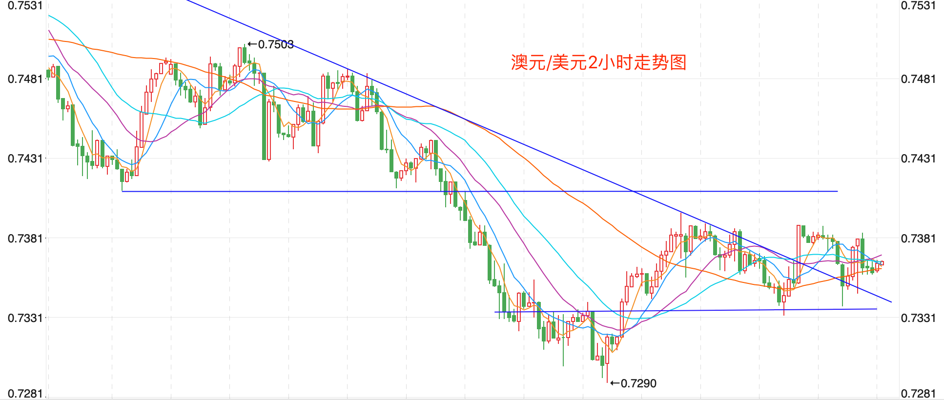 前期自2020年3月底企稳0.56618低点开启上涨走势;盘中突破了MA200均线的关键阻力而上行走高;2021年2月触及0.80072点高位后开始震荡走低。近期澳元走势企稳0.7290点后震荡走高;当前行情日内有企稳继续盘整的趋势。