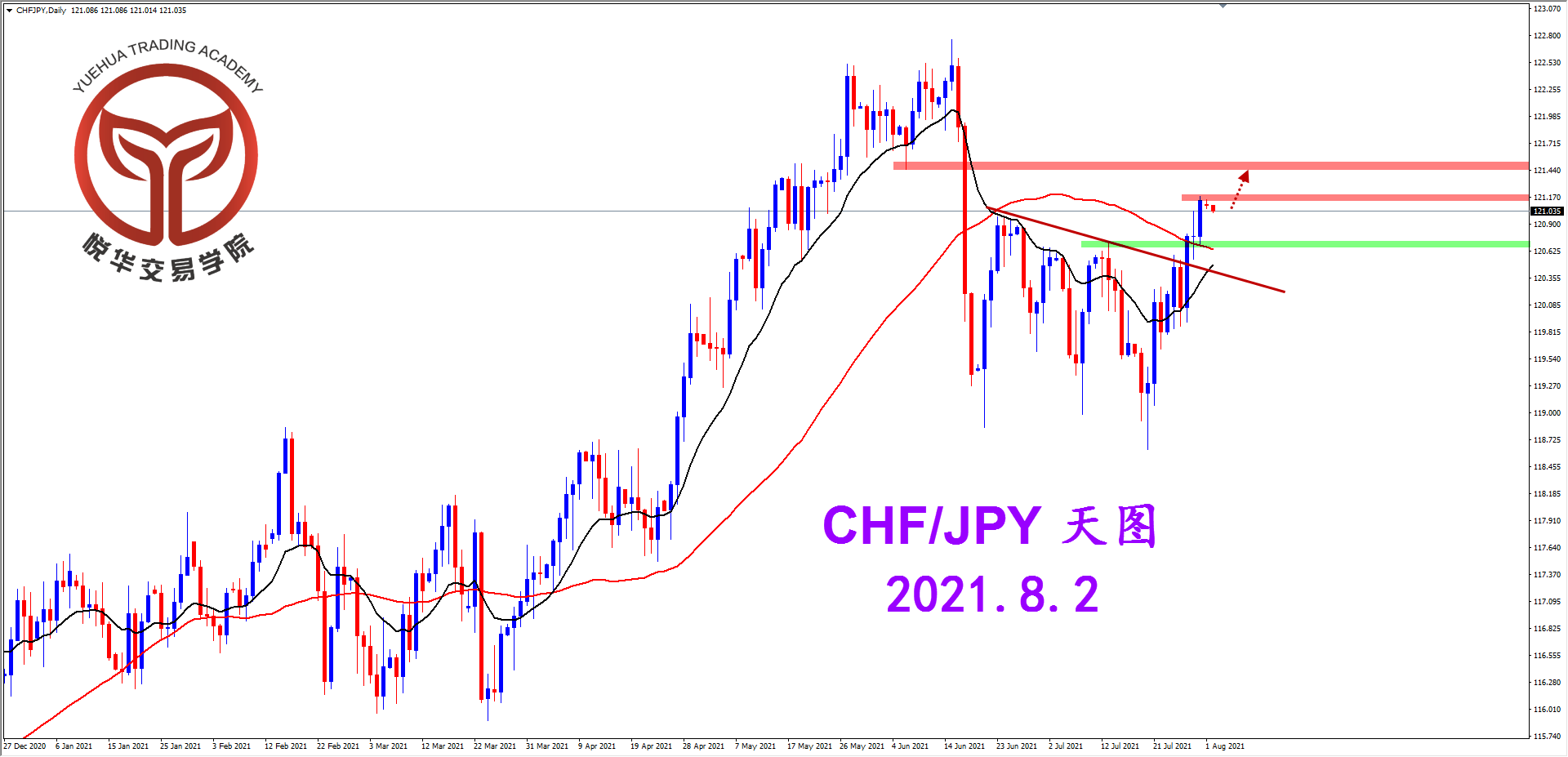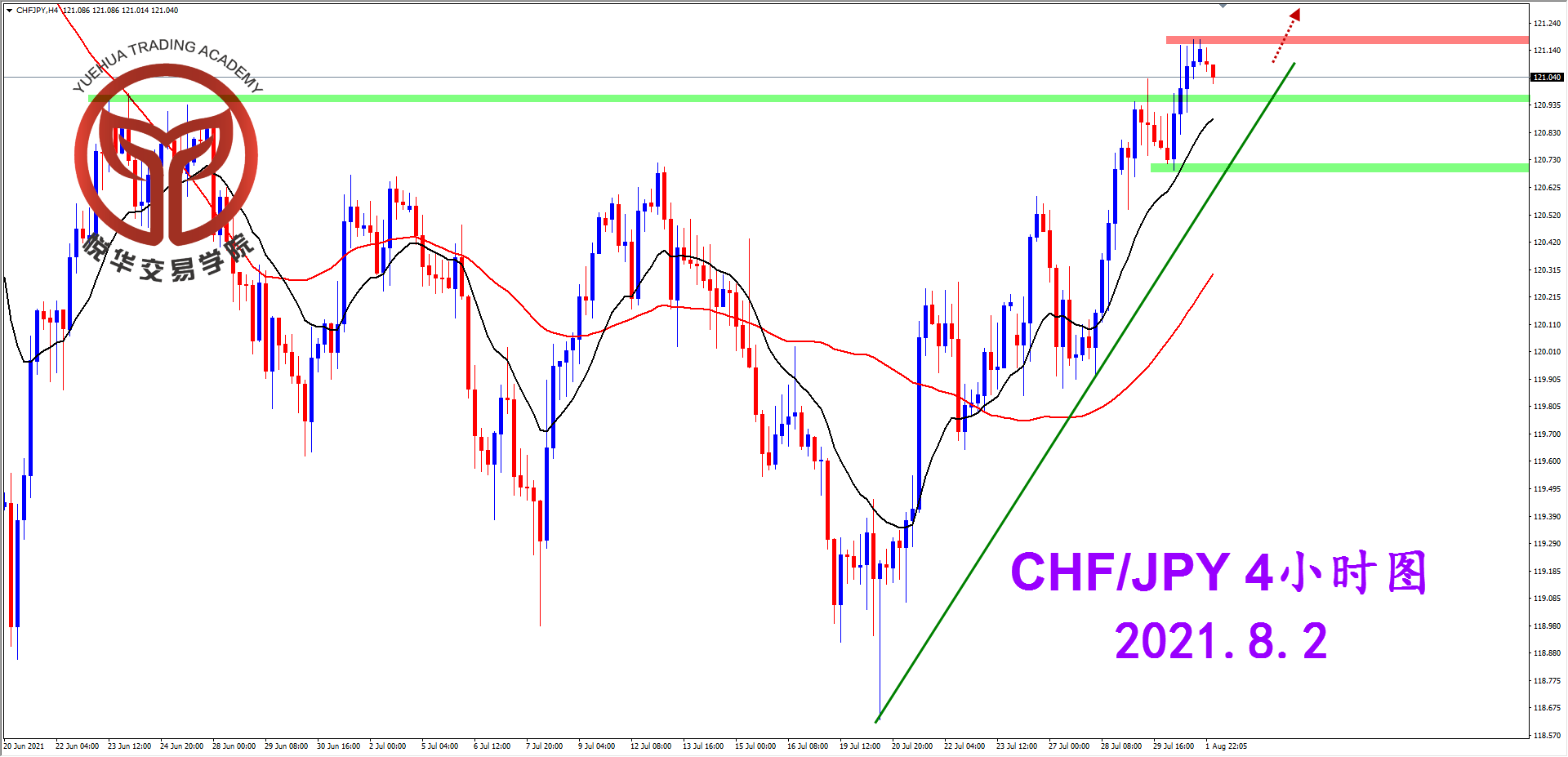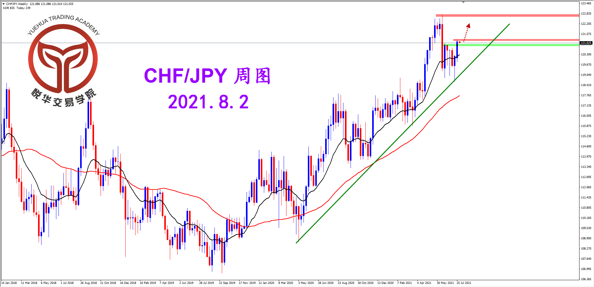 周线级别坚决阳线突破了水平压力位置,奠定了后市多头基调,121.46是有望测试的,至于能否坚决突破该压力位置要看市场表现,短线关注合理机会,搏取行情突破关键压制,如果行情在压力位置附近出现明显遇阻形态则考虑获利离场。