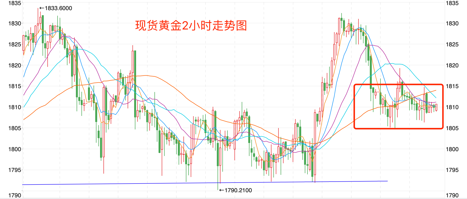 金价从1445美元/盎司的前期低点一路展开上行,创出之前2075的新高后,先回落后持续震荡下跌达到11个多月。当前整体价格在MA200上下运行,MACD指标弱势震荡,形成继续下跌的走势。日内短线走势将以1800美元关键的支持继续向上运行。