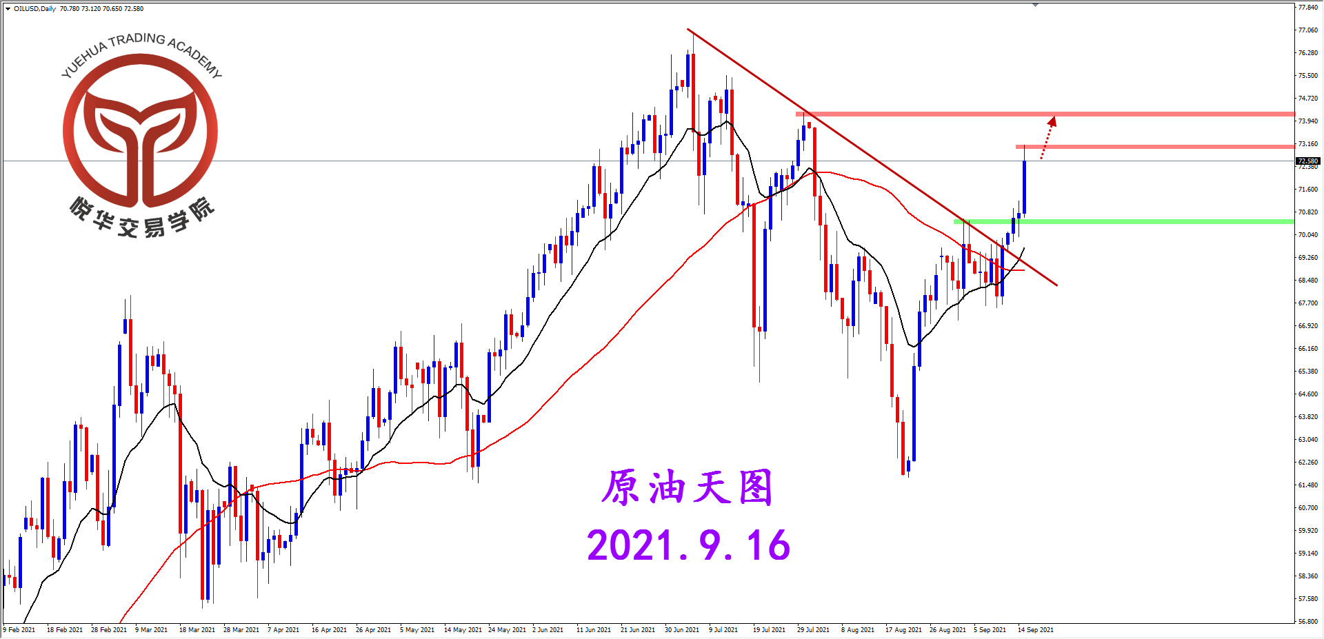 原油天图,昨天行情收出坚决阳线,多头再度回归强势,有继续走强的机会,目标位置看74.20一带,日内等待一次充分调整后的高概率破位多头。