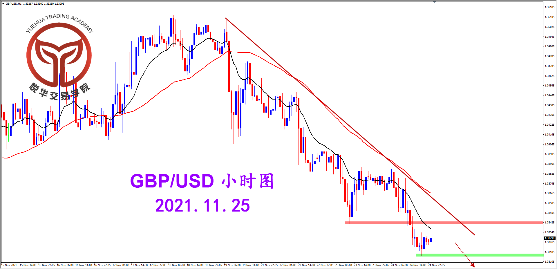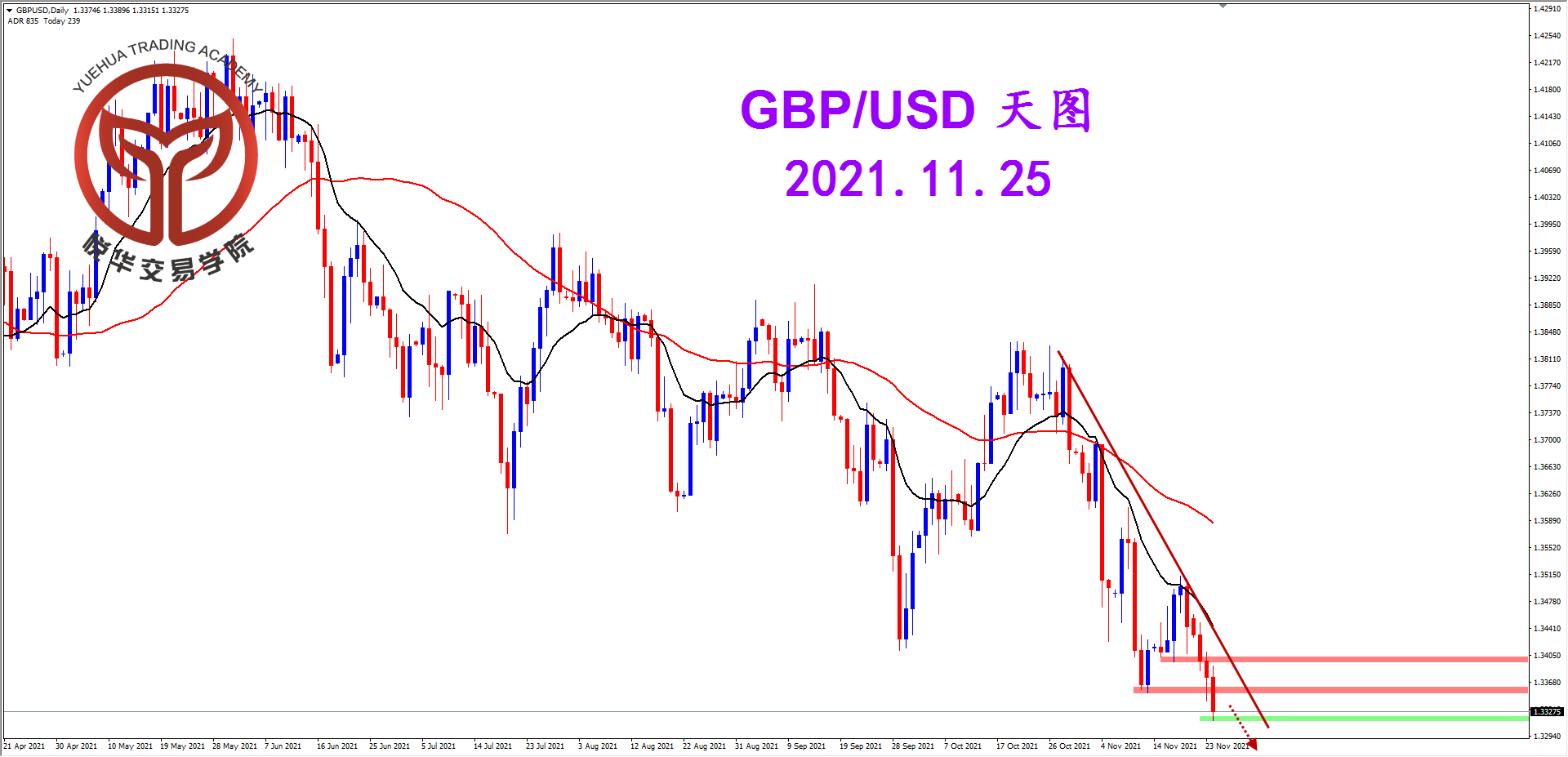 镑美天图,本周到目前为止行情连续报收阴线,虽然幅度不大但最终还是坚决跌破了前期低点,也打开了下跌空间,保持空头思路,密切关注合理的做空机会。