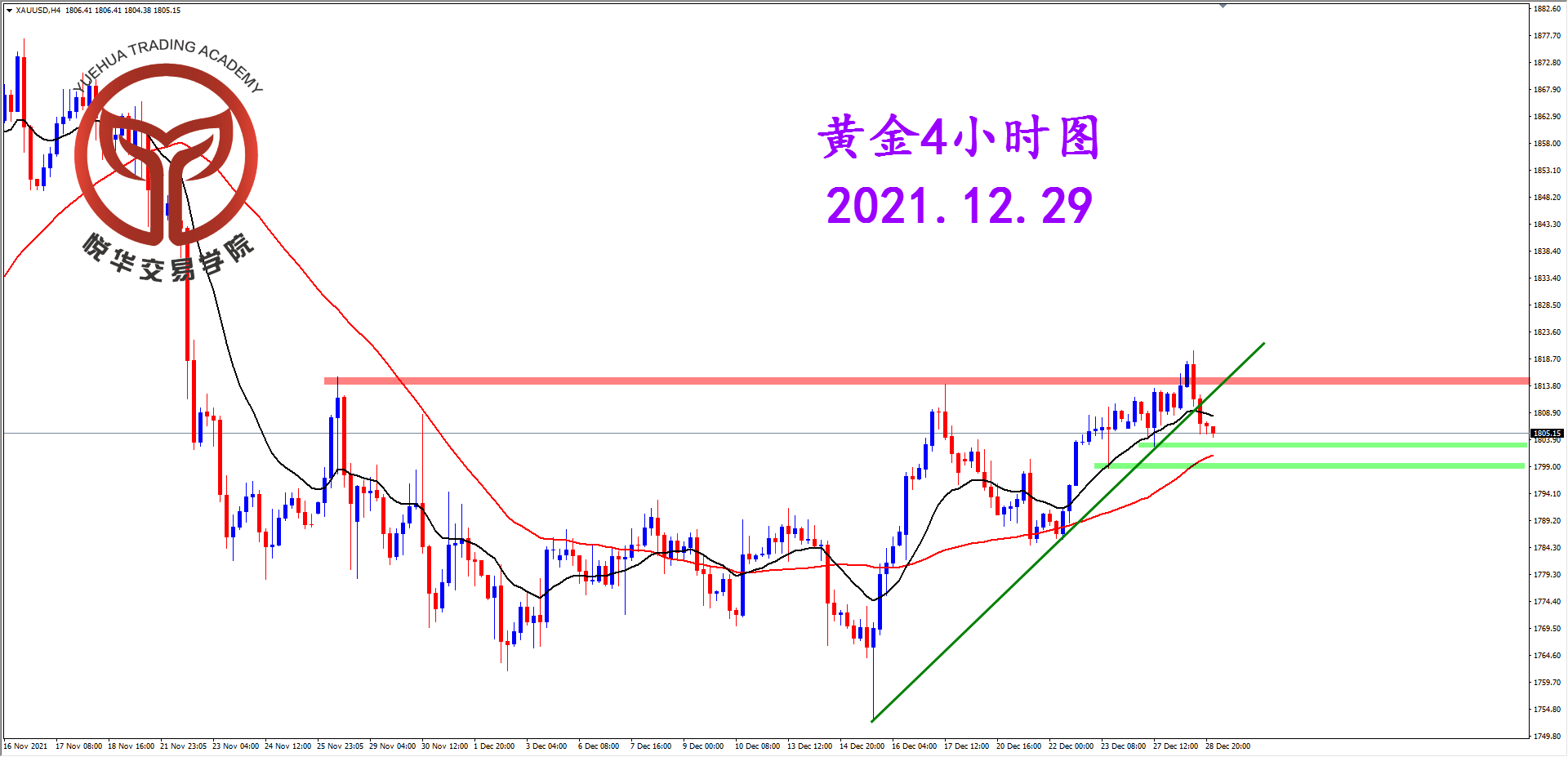 现货黄金4小时图,日内行情连续企稳向上测试,并且均线也配合多头发展,午盘后行情开始逐渐向上试探并且突破了1815.0一带的压制作用,但晚间美洲盘行情没有维系住强势,而是出现了明显的回落。
