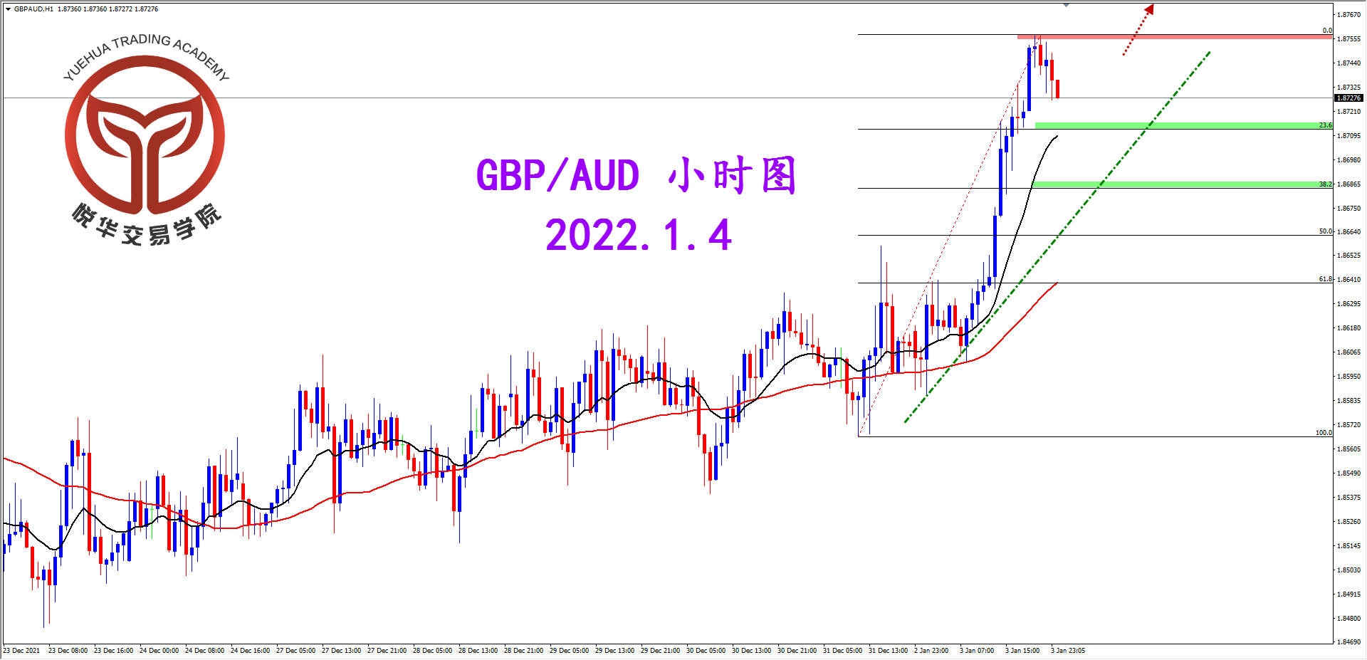 镑澳小时图,均线多头排量,市场强势拉升后需要进行调整,等待均线支撑以及斐波那契回调位置关注合理的做多机会。