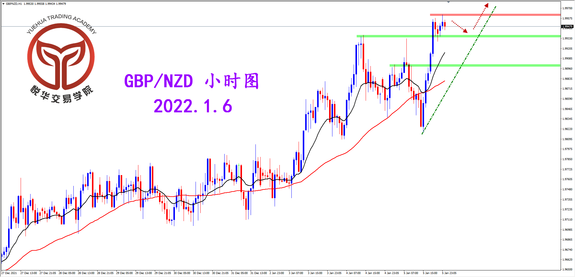 镑纽小时图,短线行情从相对地位一路向上,在短期动能释放末端突破了前期高点压制,虽然多头强势但也不要追买,等待行情在上方在进行必要调整,调整充分后关注合理机会。