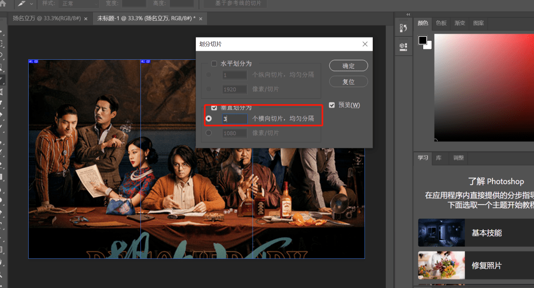 6、输出:3个,点击确定。可以看到画面已经被划成三等分。