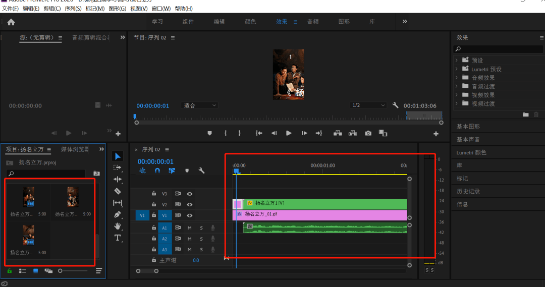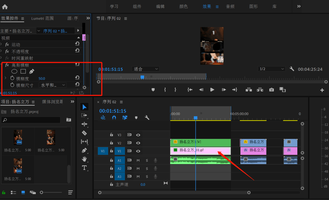 13、再将素材1拖入时间轴,置于视频下方作为背景图,在pr【效果控件】—【高斯模糊】,再拖拽模糊数值,使背景图模糊。