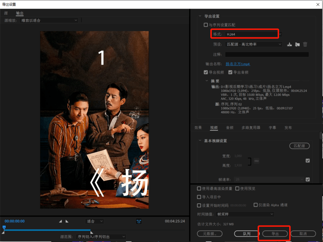 14、使用【入点】【出点】确定生成区域。点击ctrl+m呼出【媒体】界面,设置相关的参数,最后导出视频。