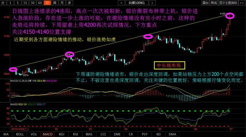 白银:昨日延续前几个交易日的多头格局,开盘之后在开盘价格有所徘徊之后再次开启了上涨的势头,最高触及上方4070位置之后,回调至4020附近盘整,于美盘阶段再从冲高至4180位置,多头之凶猛相比前几个交易日有过之而无不及,目前日线上看再次收得大阳,呈现红三兵姿态,目前价格整体运行与布林带上轨和各周期均上方,布林带呈现开口的姿态,个周期均线纷纷扬头向上,附图指标上红色动能持续放量,RSI和KDJ多头发散。