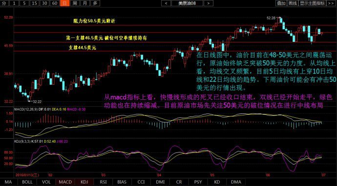 从本周的走势中我们可以看出周初行情多头一直很弱势,但是自EIA日行情走高以来,周四、周五两日行情一直在试探前期高点,但因当前供求过剩的环境影响,走高回落后以缓慢震荡上行的方式延续,目前下方支撑重重,上方看不到强劲阻力,KDJ有粘合走平之迹,短线看涨,中长线看跌。