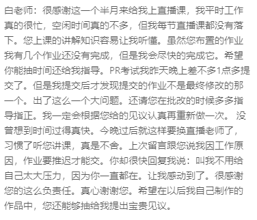 在PR阶段最后一节课,收到这位同学发来的留言。说实话,能收到学员的感谢,是我做职业教育最开心的事。身为一名老师,同学的肯定,是我们前进不懈的动力。