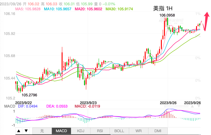 美指短线(1H)走势保持强势上涨态势,突破前高再创新高106.10附近。早盘汇价在高位窄幅盘整,整体呈次要节奏。并且汇价收到均线系统良好的依托,短线主客观趋势一致上行。日内美指在欧洲开盘发力继续上行。