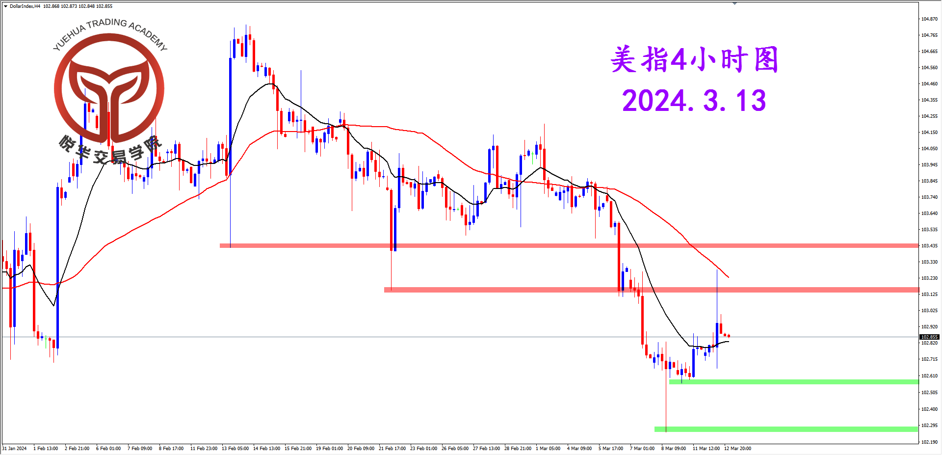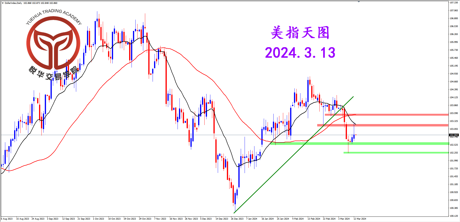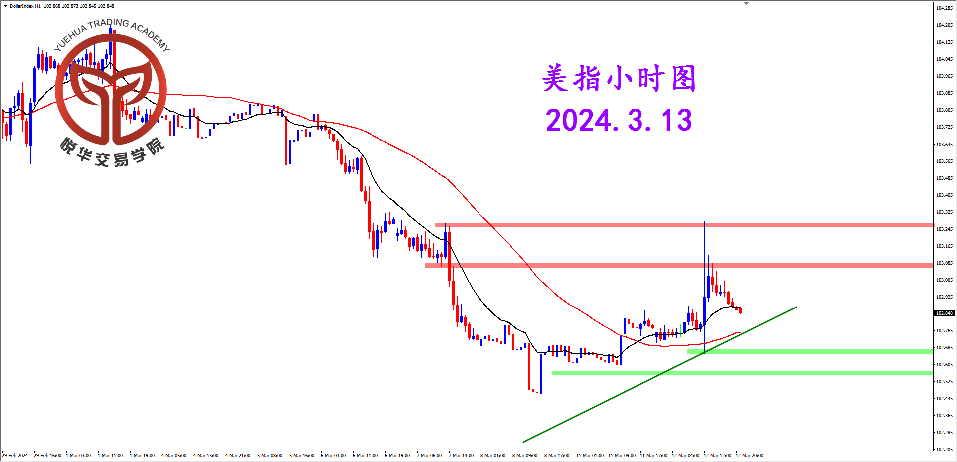 美指天图,昨日行情于晚盘在美国CPI数据发布后出现了明显的异动,虽然有过快速拉升但目前看也收复了大半失地,技术形态看行情还是属于回测均线和103.15的水平压制遇阻,但空头还不要急于介入。