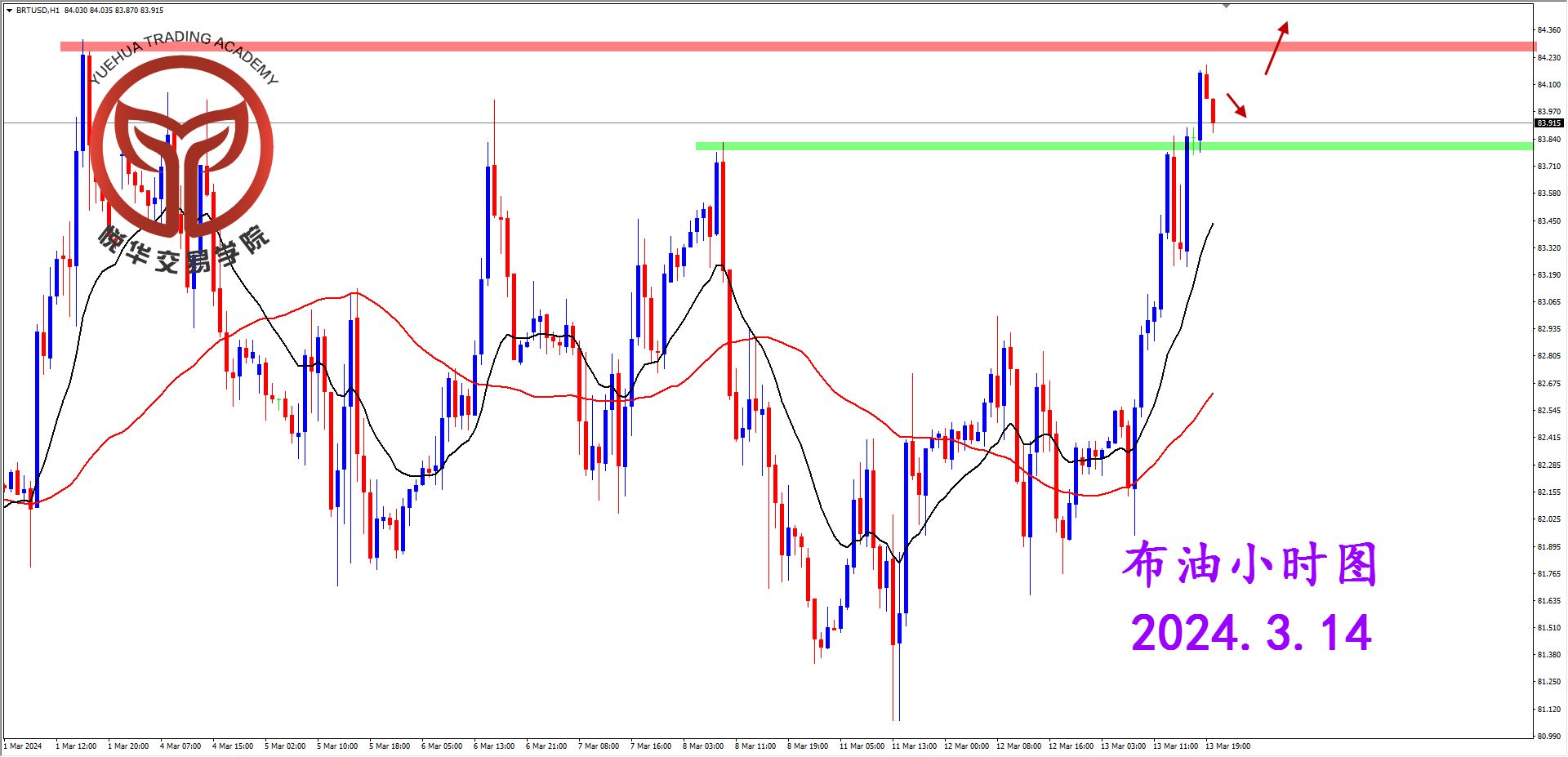 布油小时图,均线保持多头排列,短期多头方向虽然明确但也需要密切关注水平压制的存在,关注压力位置附近的突破形态,或者等待突破后的二次机会。