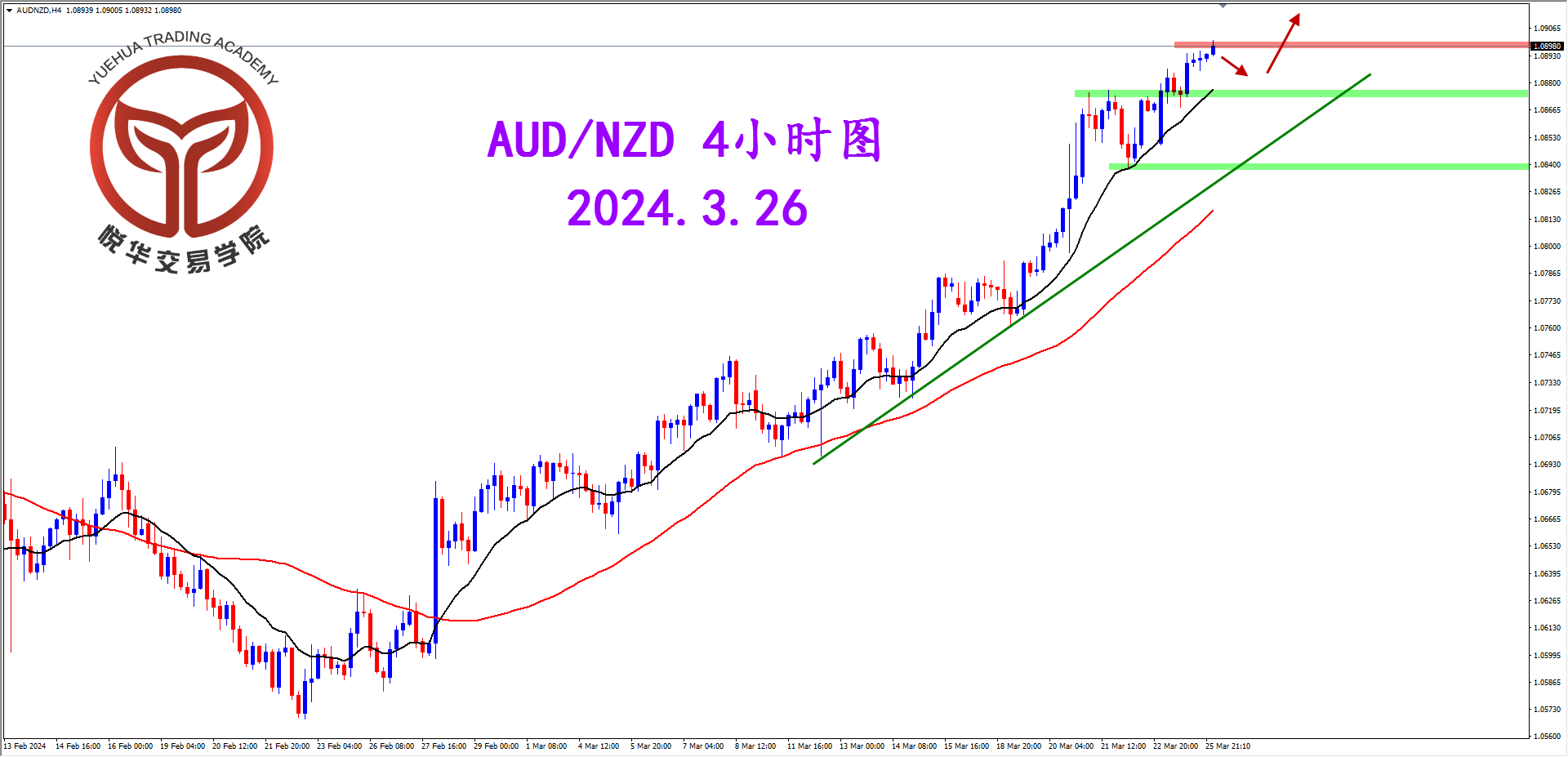 澳纽4小时图,行情调整后强势突破了1.0876的压制作用,多头流向延续发展,方向相当明确只是拉升极端,再多需要有更加合理的形态配合才能关注。