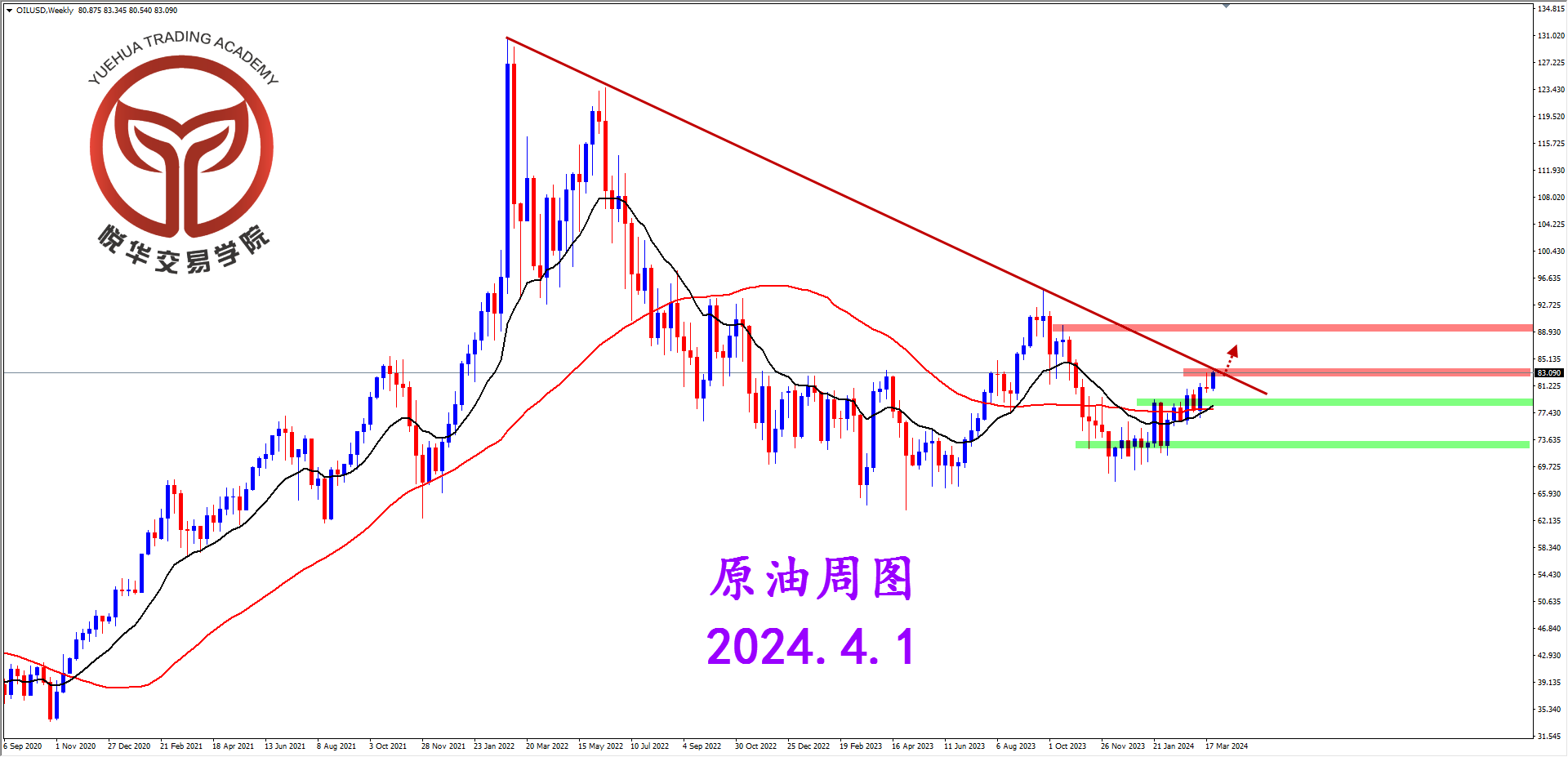 原油周图,上周行情收出小根阳线,短期表现偏强但格局空间暂时不多,适当关注一些短线的多头机会,如行情能够爆发多头势能,那么就可以持单获利,否则也只能谨慎关注。