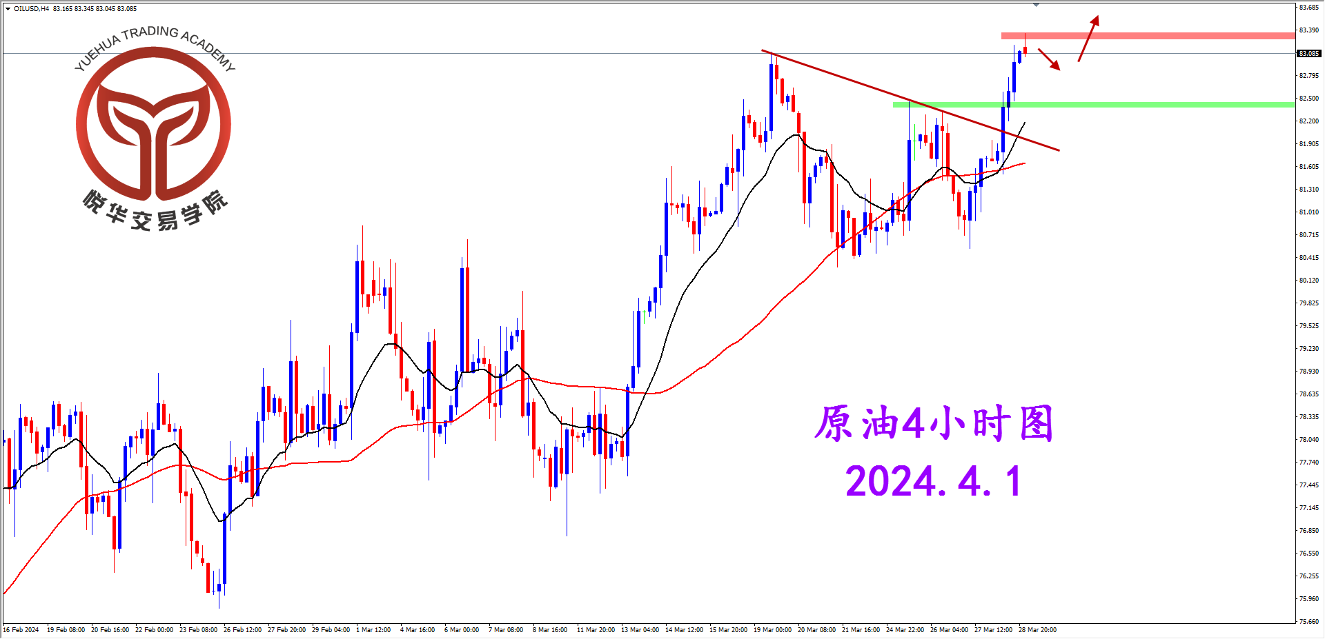 原油4小时图,行情强势突破压力线以及82.48的水平压力位置,目前在83.11附近测试调整,如果直接突破则不要追买,耐心等待小时级别的横盘充分调整结束后的可能的买入机会。