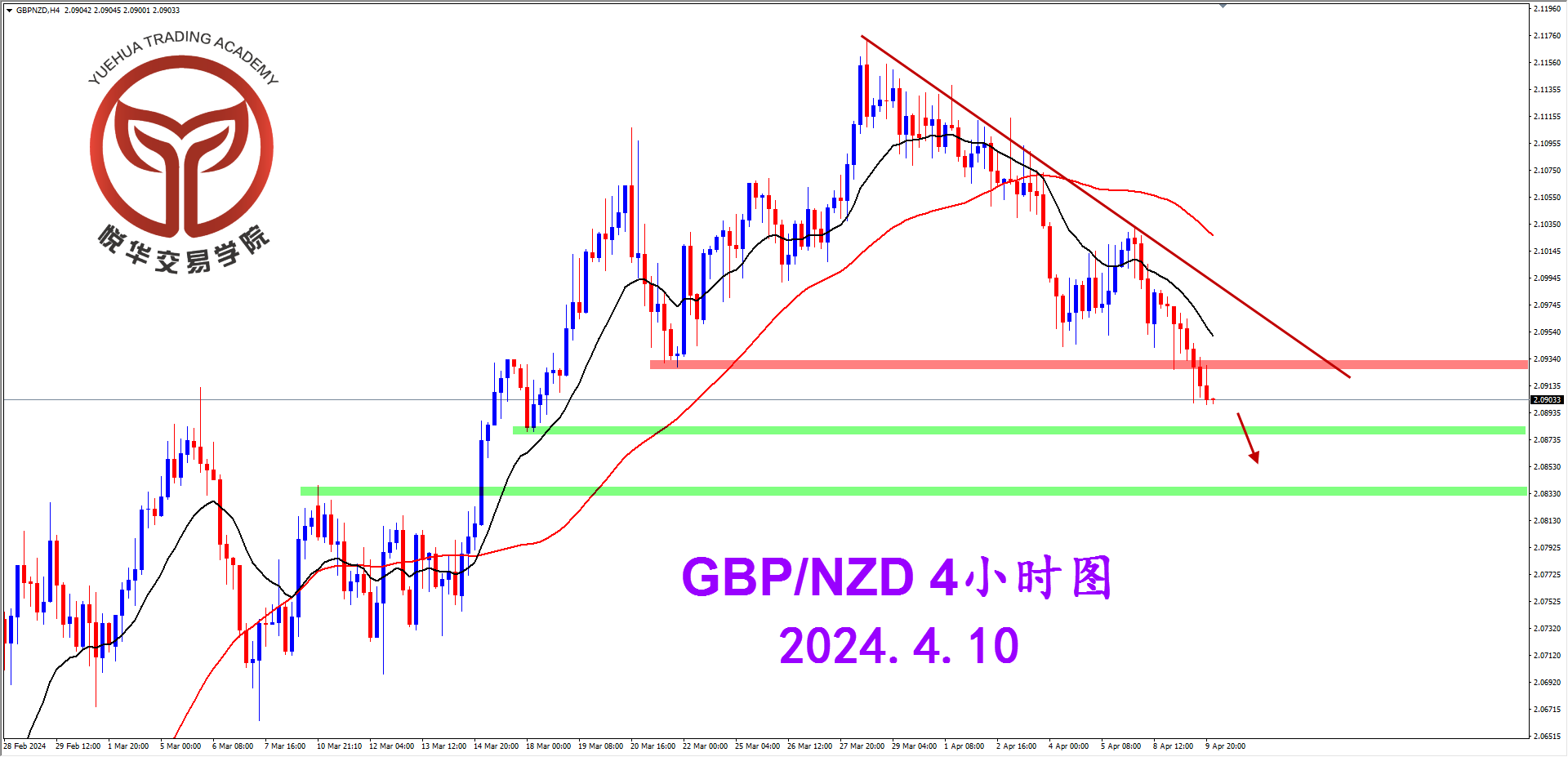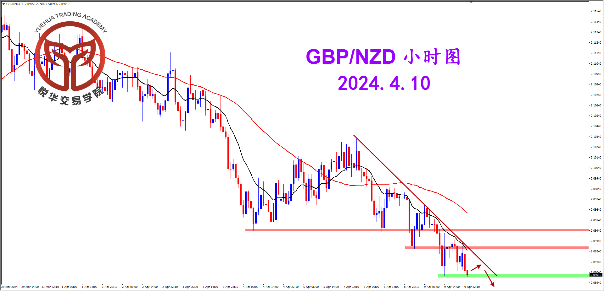 镑纽小时图,虽然行情价格不断下探但过程曲折复杂,现在直接破位不建议直接入场,最好是通过横盘调整改变不利因素,再关注合理形态加持下的破位空头机会。