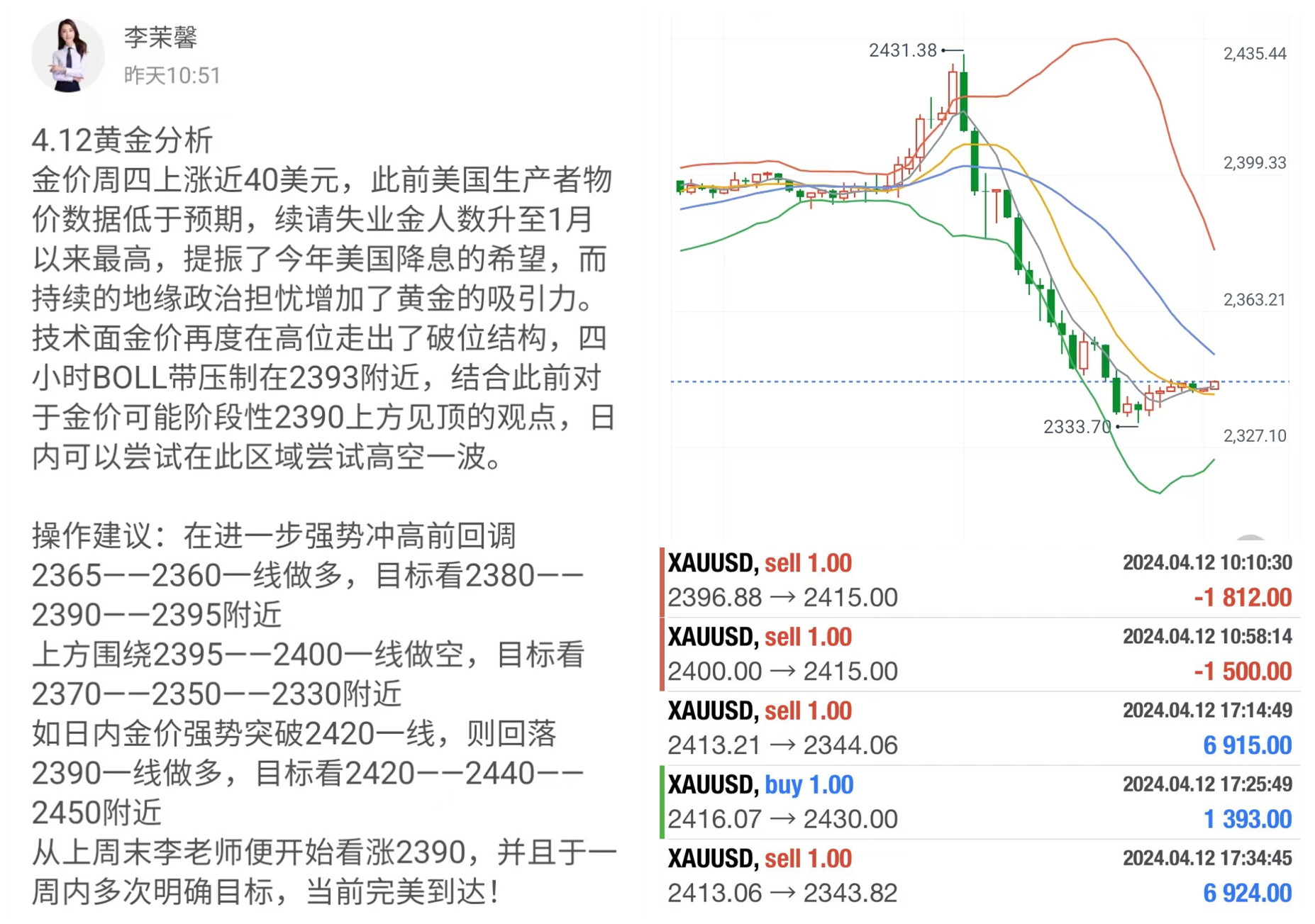 自上周末以来就预测接下来金价可能在2395——2400一线见顶,本周周一到周四看涨黄金成功,周五在2395——2400一线做空先行止损后再度在2413一线继续做空,随后2416一线做多对冲交易,多单在高位2430止盈后,在下跌过程中重新加仓做空,最终在下方2344和2343一线离场。